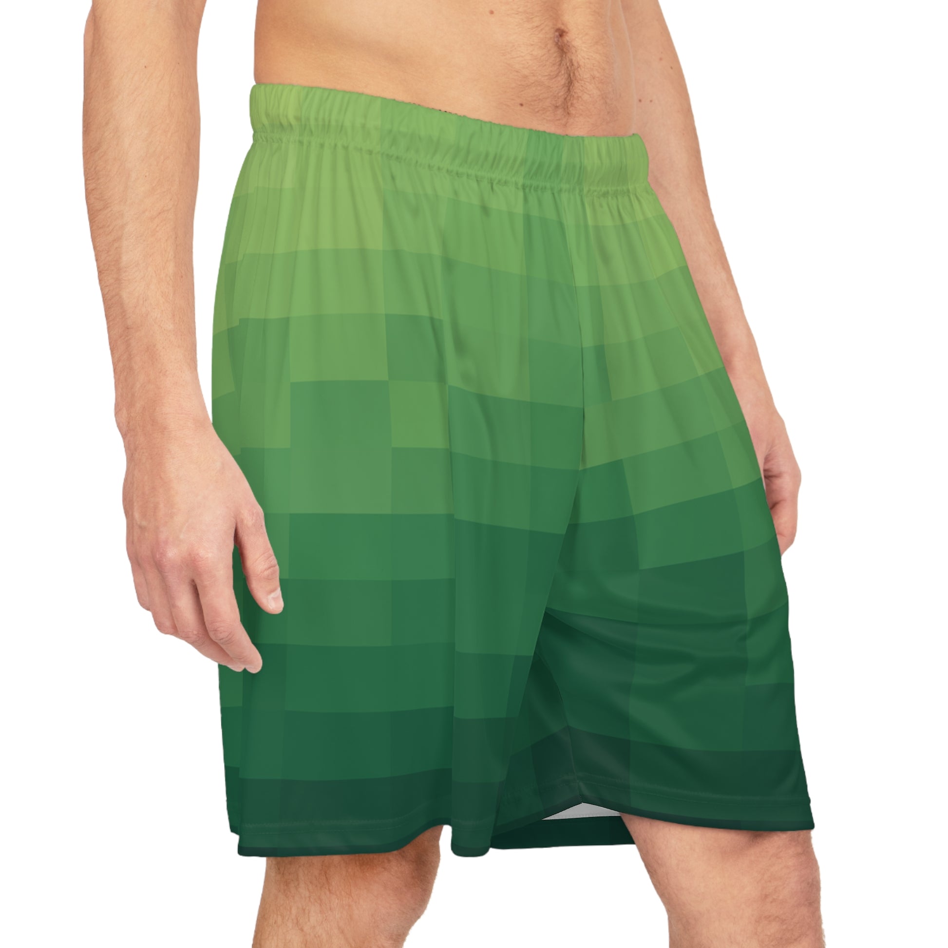 Our 8-bit Green basketball shorts are game-ready! A retro arcade pixelated design and soft, breathable fabric make them the perfect match to play with you, either on the court or from your screen. They have a comfortable and adjustable elastic waistband and drawstring. , and are made of moisture-wicking polyester. These extra light shorts have no pockets and are assembled in the USA from globally sourced parts.