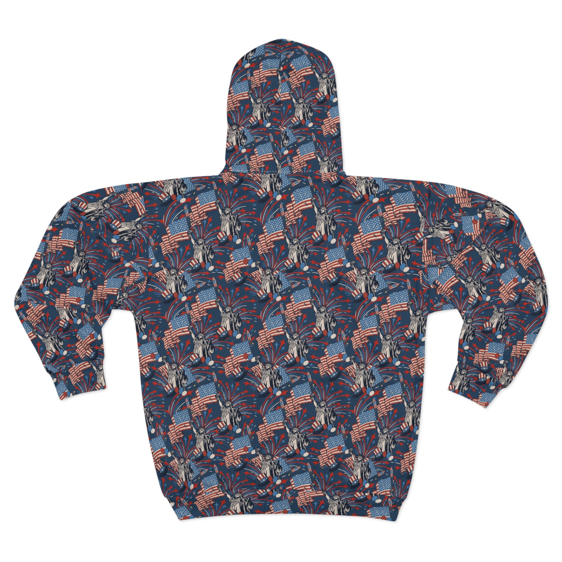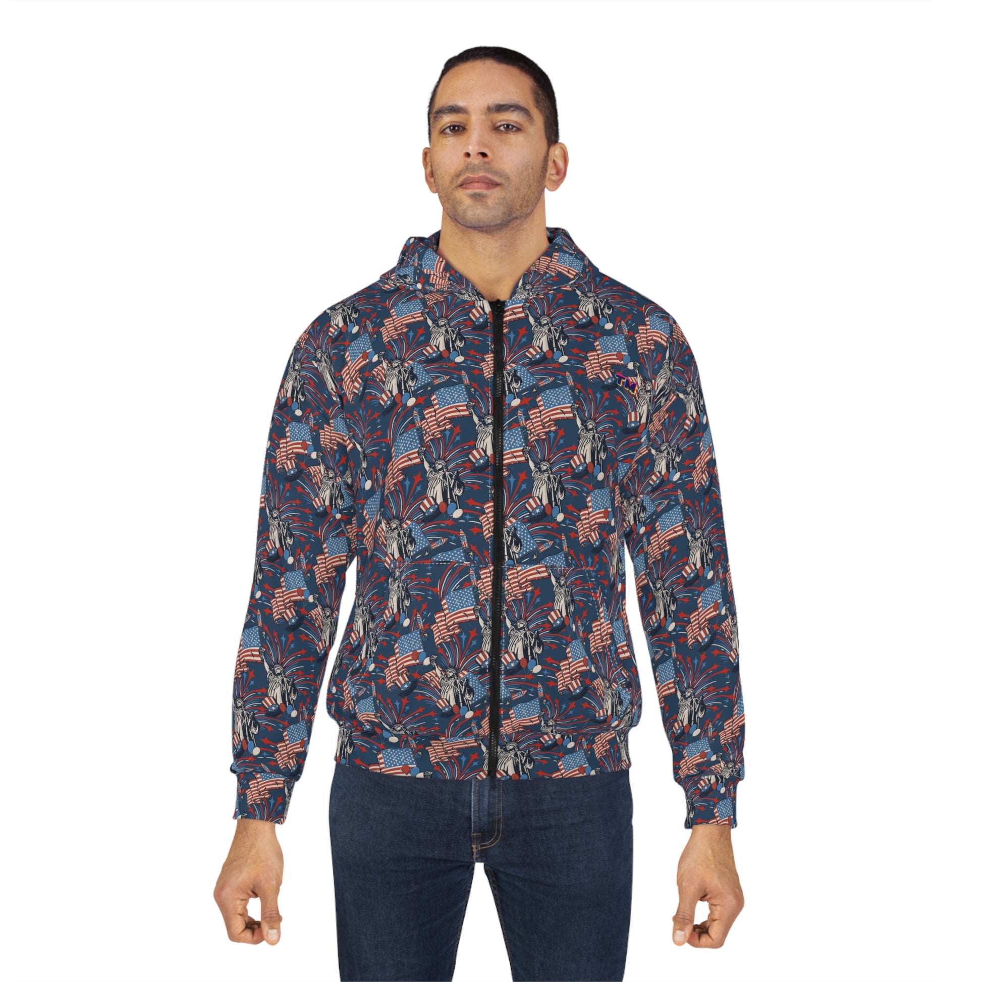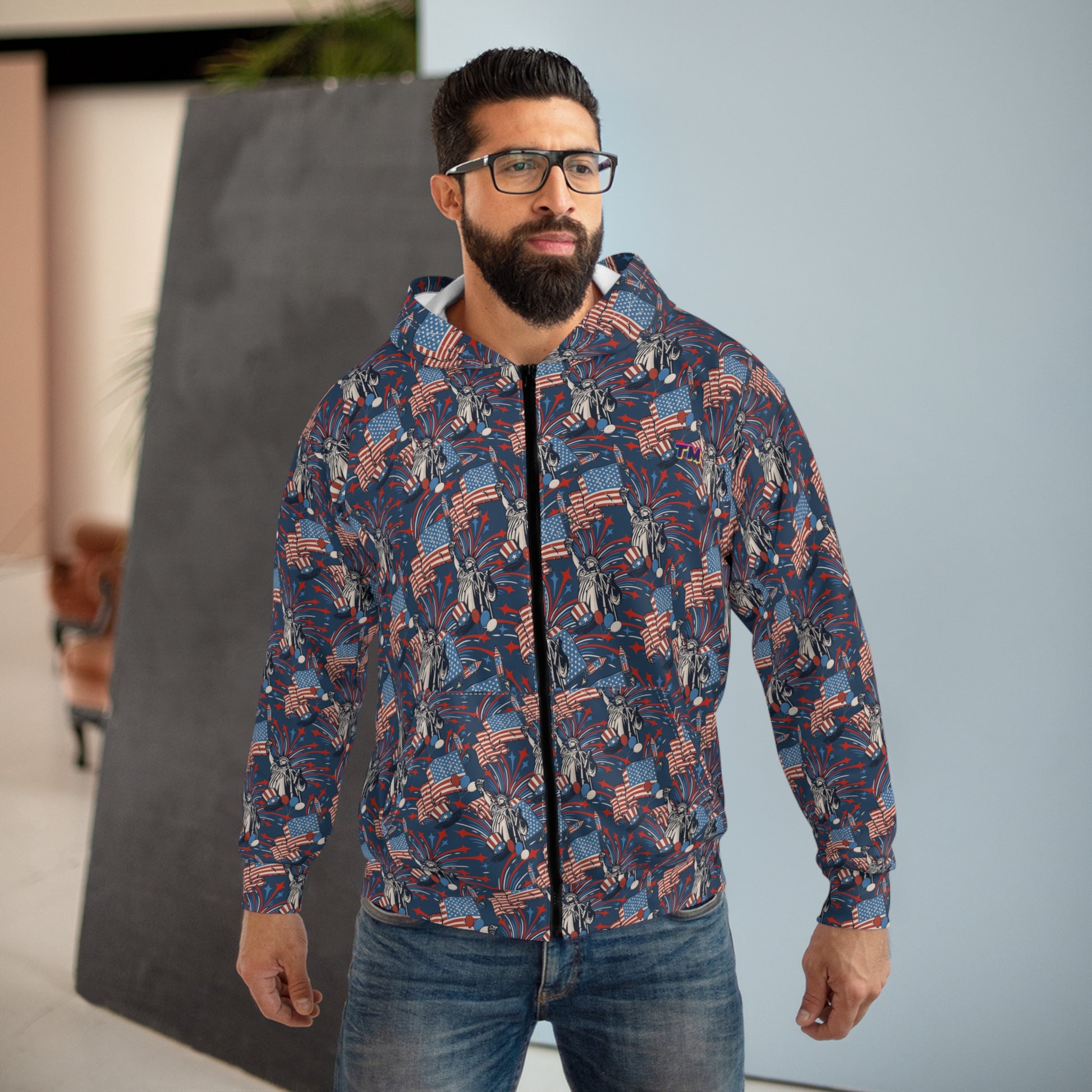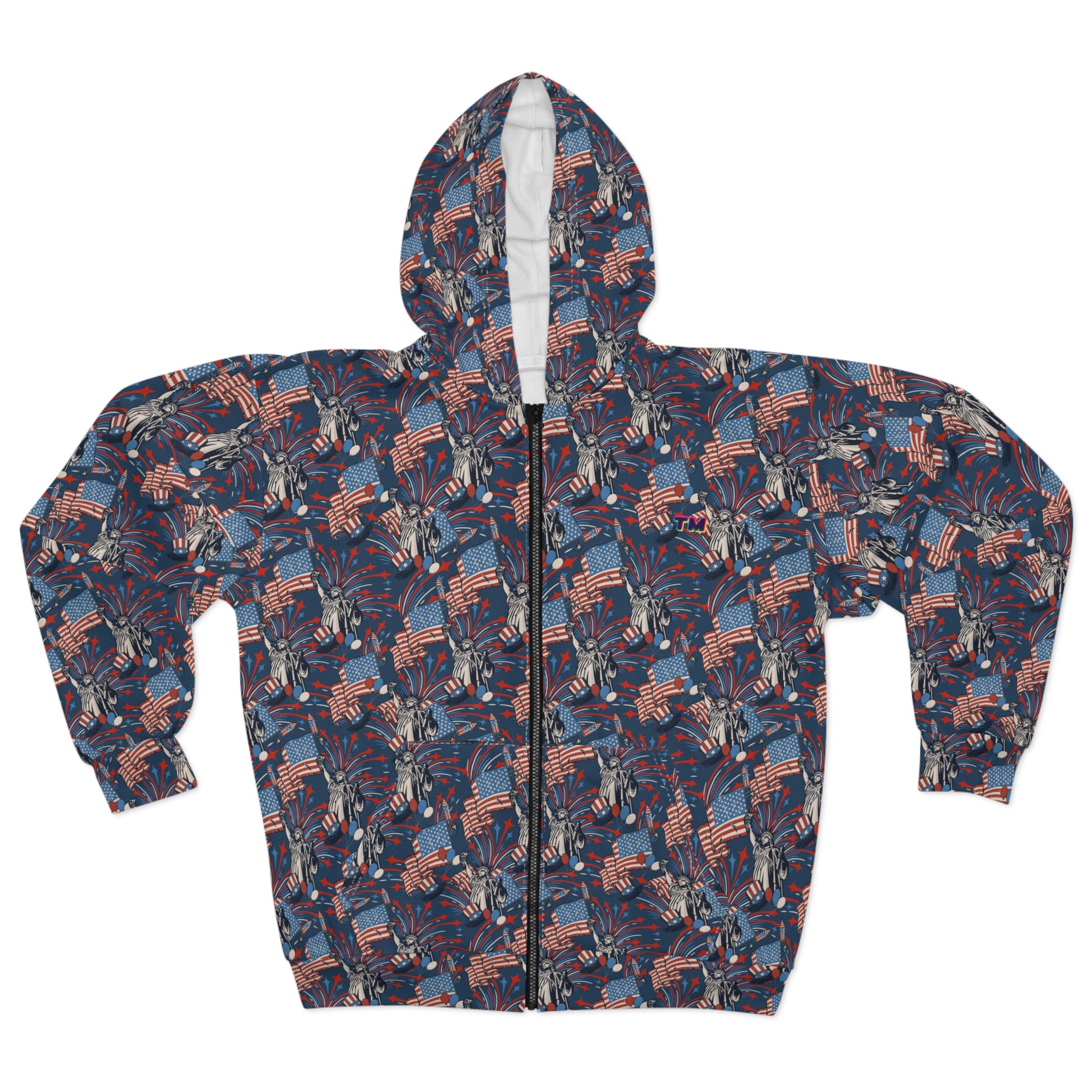 This American Icons Pattern Zip Hoodie features spacious pockets to keep your hands warm, bright and intense colors in a full decoration design. Made from 100% polyester, this medium weight fabric hoodie is durable and dries quickly. The classic fit hoodie with a black zipper and white thread color is custom cut and sewn, assembled in the USA from globally sourced parts. Perfect for those who love American icons and want to stay cozy in style.