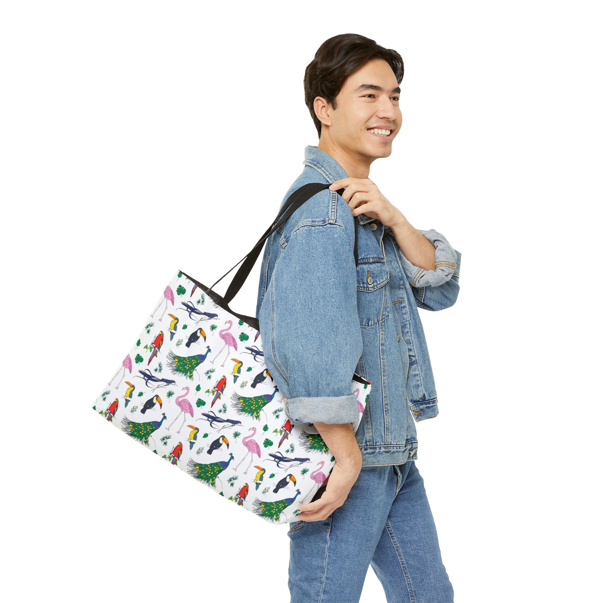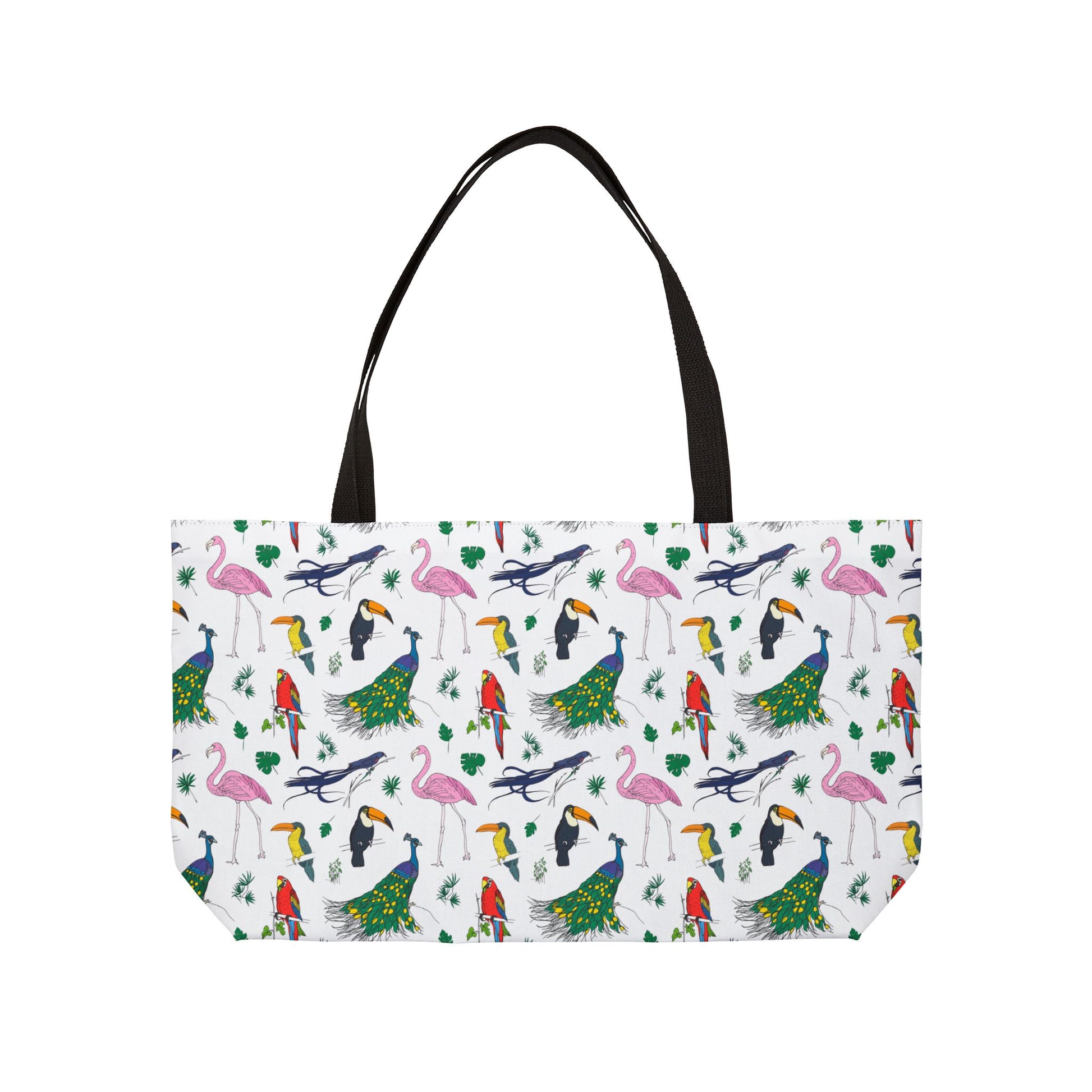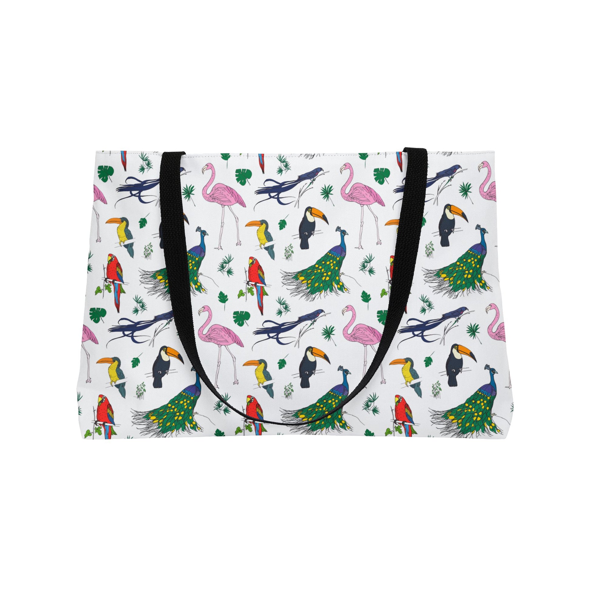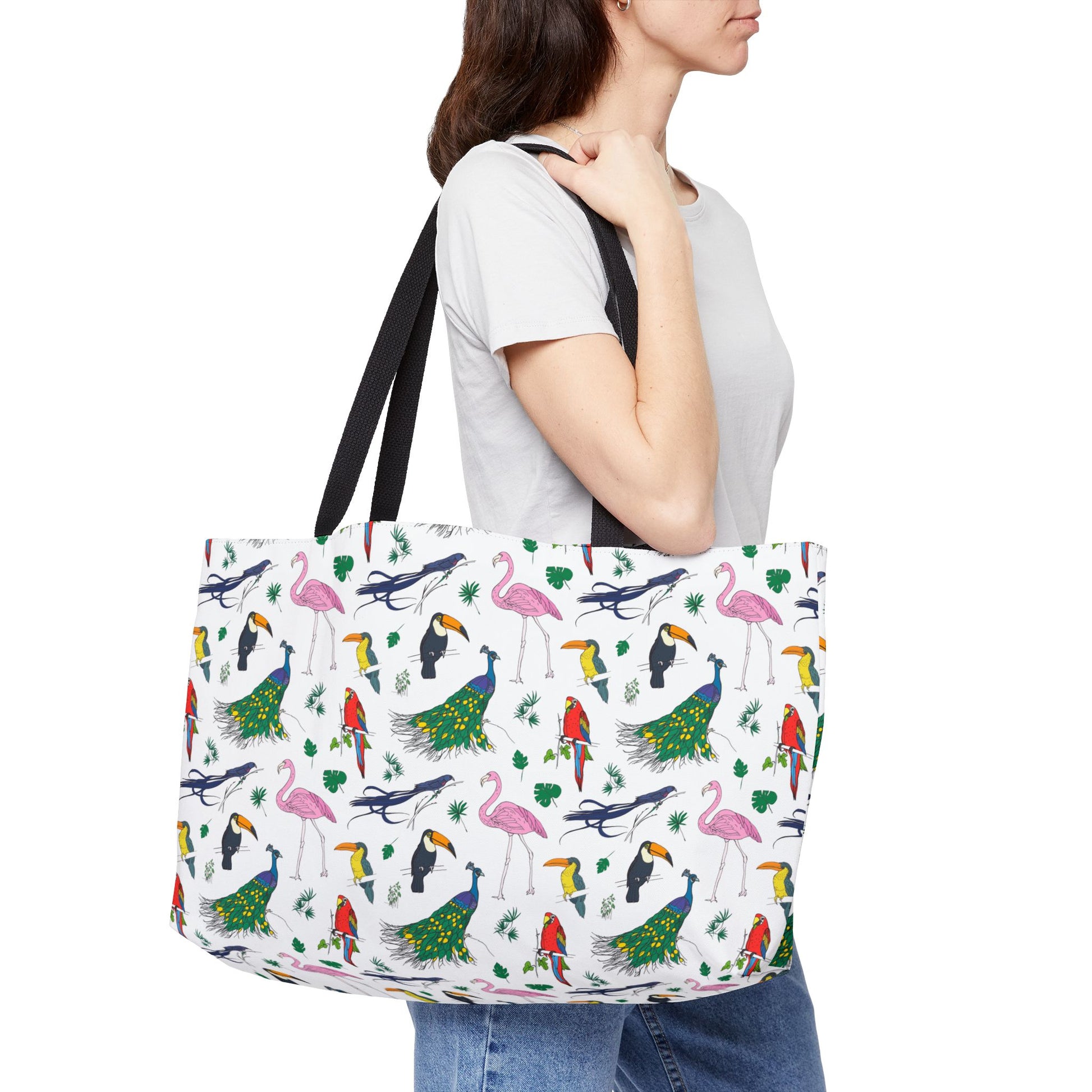 Introducing the perfect travel companion for your on-the-go lifestyle: our stylish Avian Weekender Tote Bag with a vibrant pattern of colorful birds. Made from 100% spun polyester, this chic accessory is as durable as it is fashionable. Measuring 24" x 13" (60.9 cm x 33 cm), it offers ample space to store your cosmetics, toiletries, or daily essentials while remaining compact and lightweight. The sleek black interior lining adds a touch of sophistication and keeps your items secure with its sturdy zipper closure. Whether you're jet-setting across the globe or simply heading to the gym, this versatile bag is designed to meet your needs with flair. Embrace convenience without compromising on style with this must-have travel accessory, perfect for women, teens, and avian enthusiasts alike. Elevate your travel game and make a statement wherever you go with our trendy, practical, and irresistibly cute Avian Weekender Tote Bag.