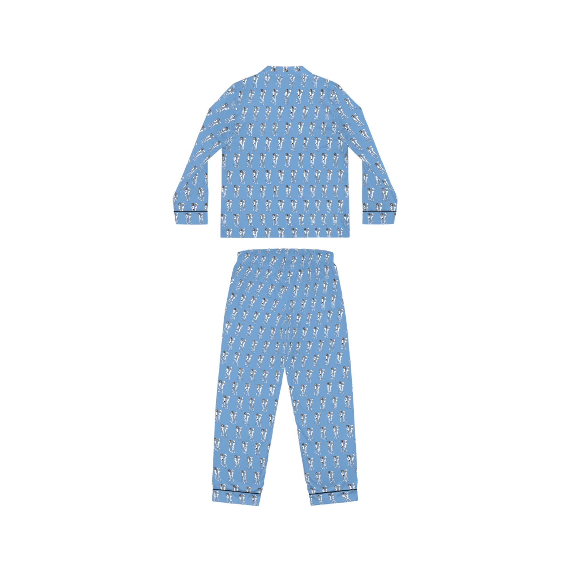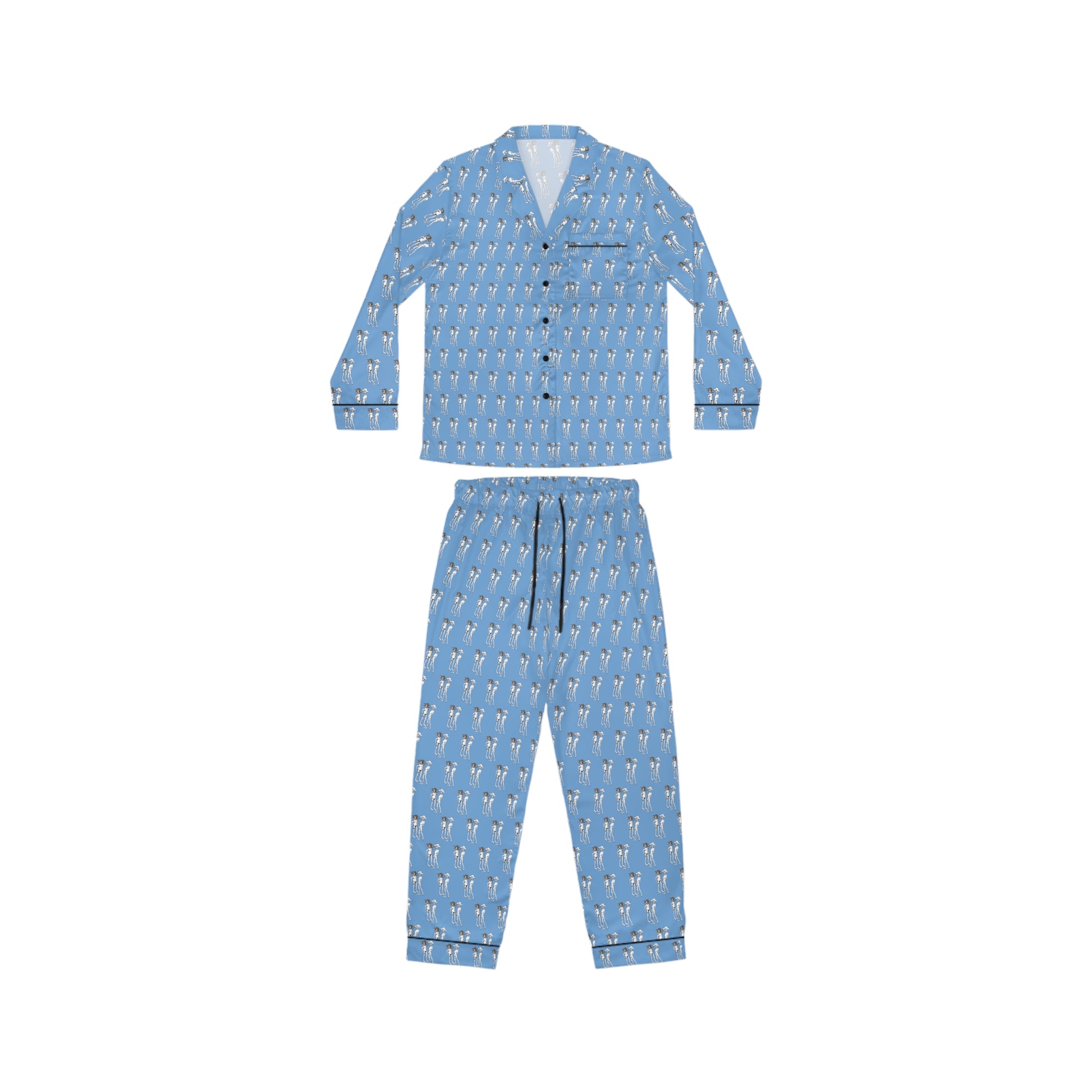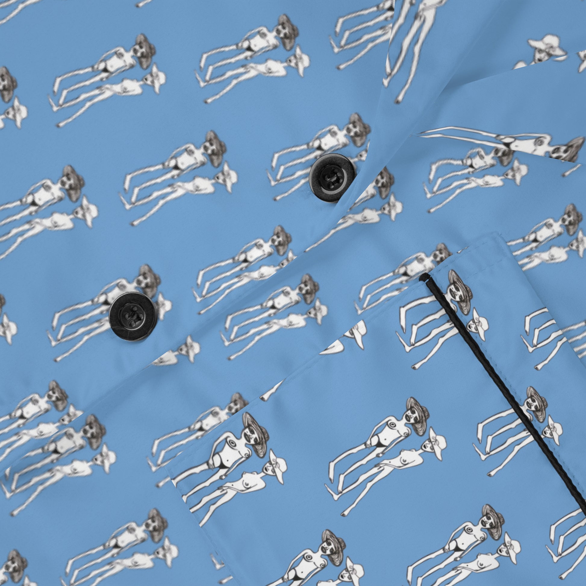 The print is what sets them apart—hand-drawn, fiercely original bikini-clad characters rocking oversized hats on a vibrant blue backdrop. It’s fun, edgy, and impossible to ignore. With a button-down top, refined black piping, and pants that fit like a dream, this set proves that even your downtime deserves a touch of fearless style.