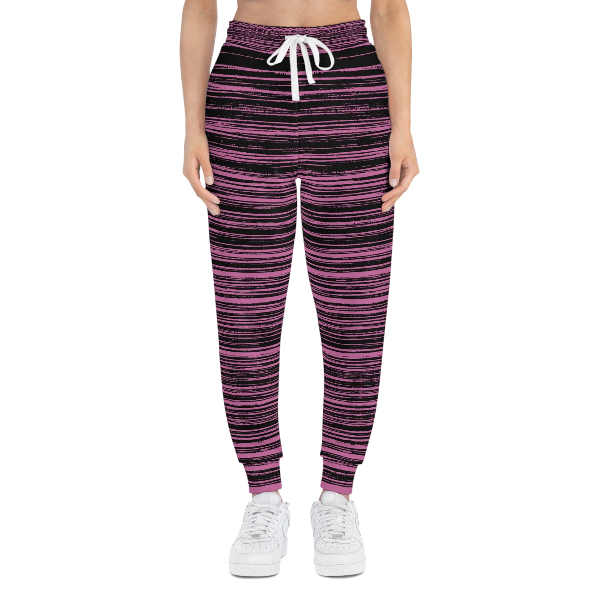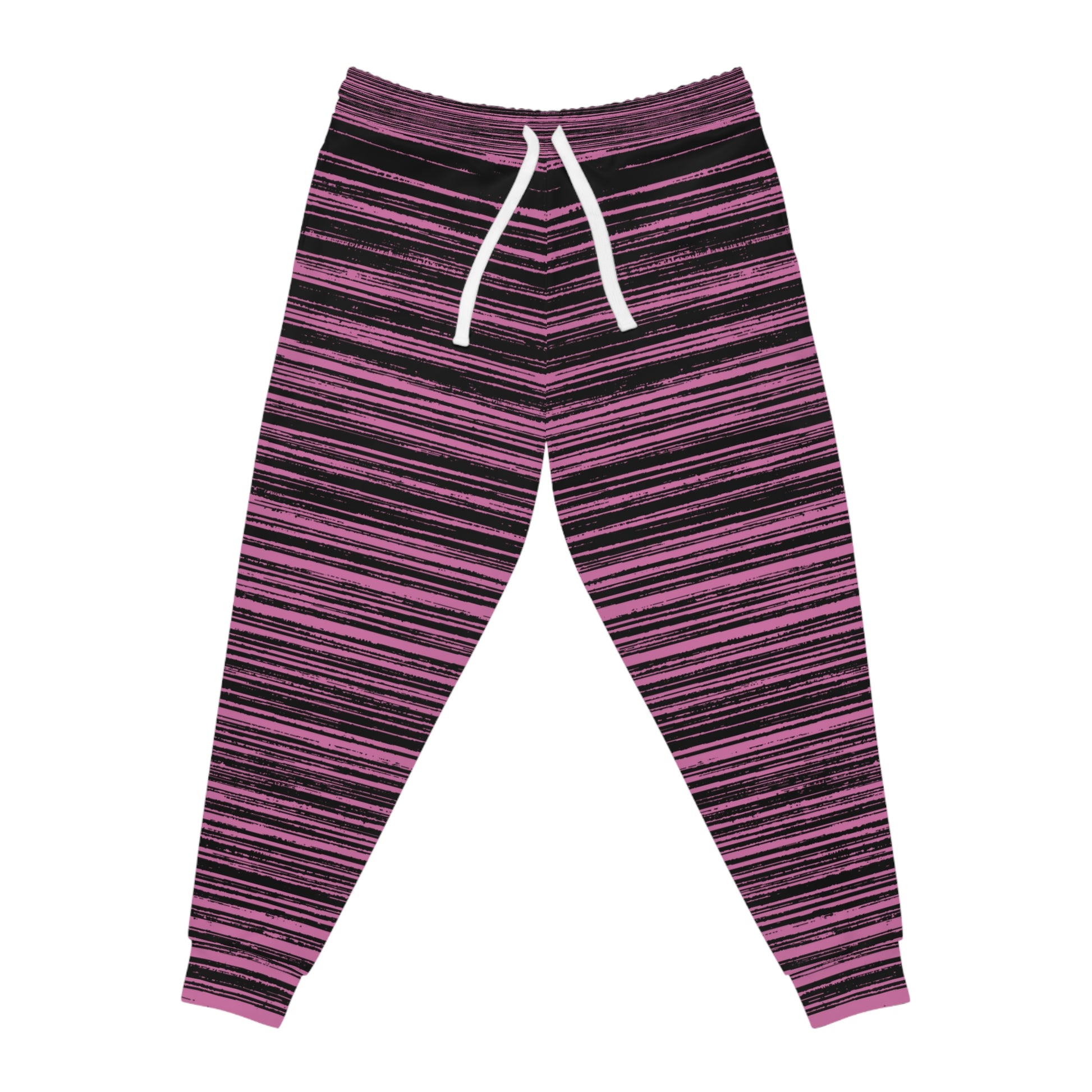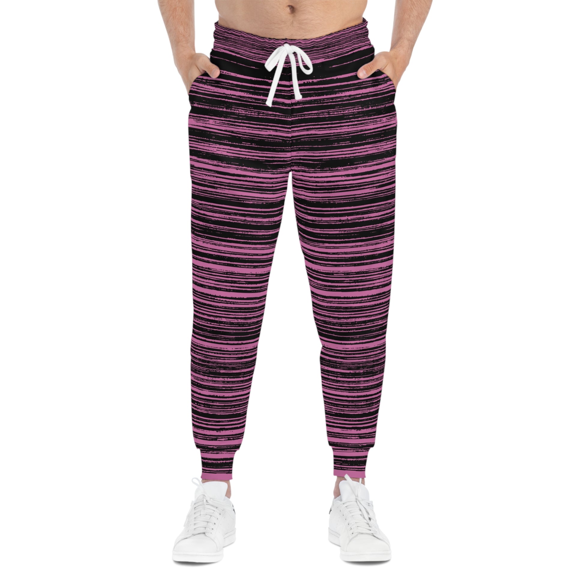 Add flair to your wardrobe with these Black and Pink Striped Joggers. Made from soft, stretchy fabric, they offer comfort and style with bold stripes and versatile design.