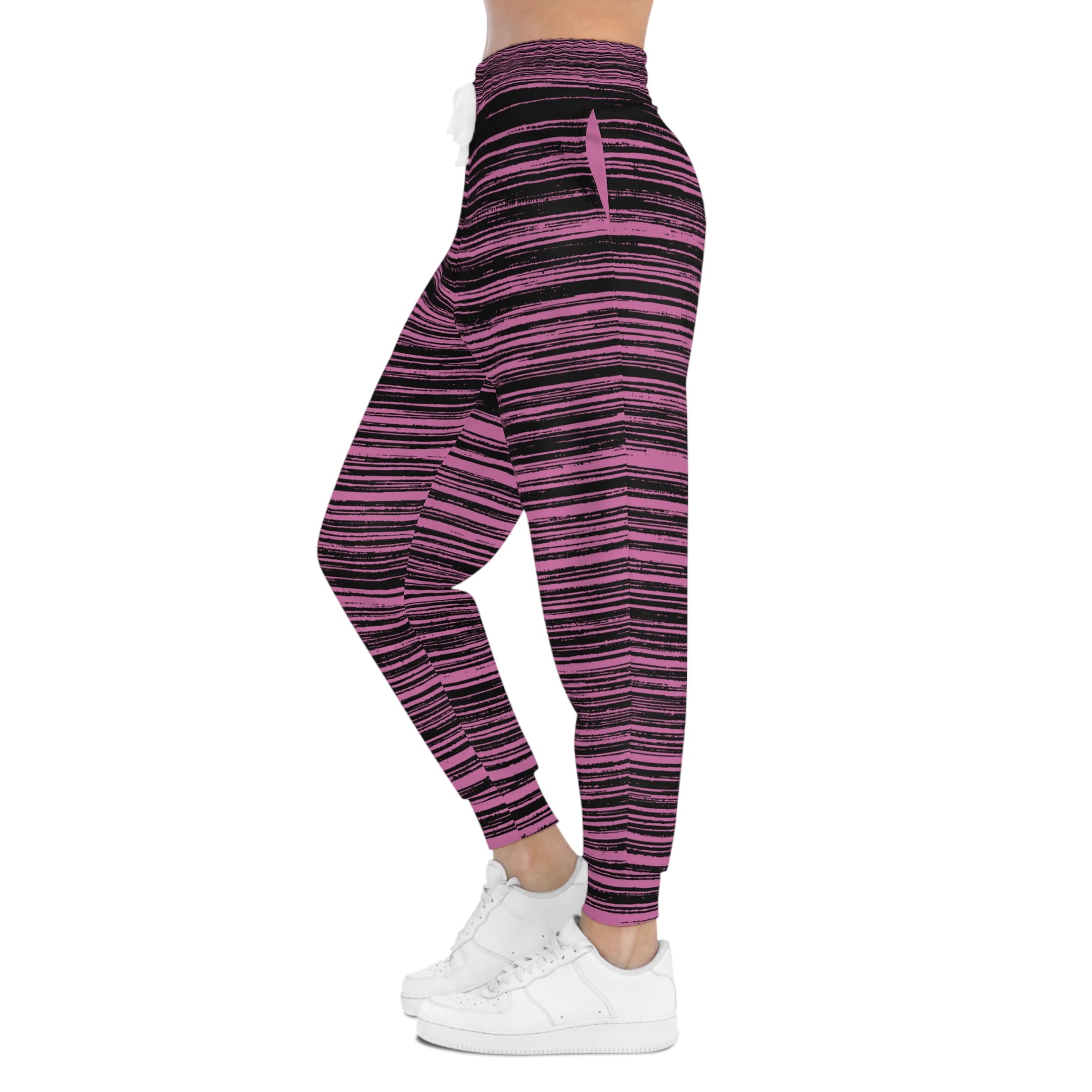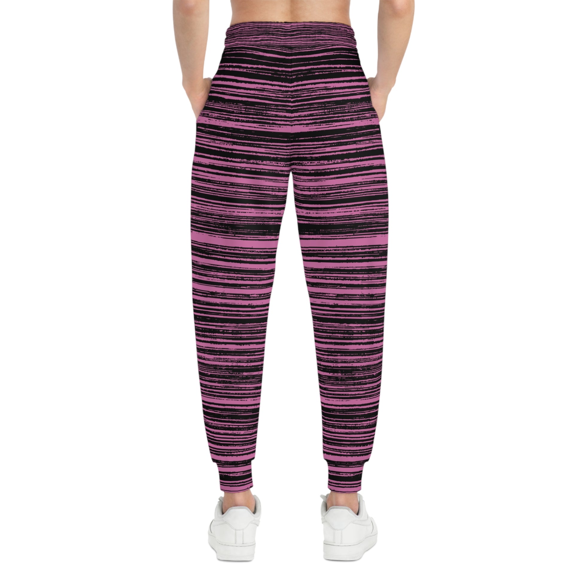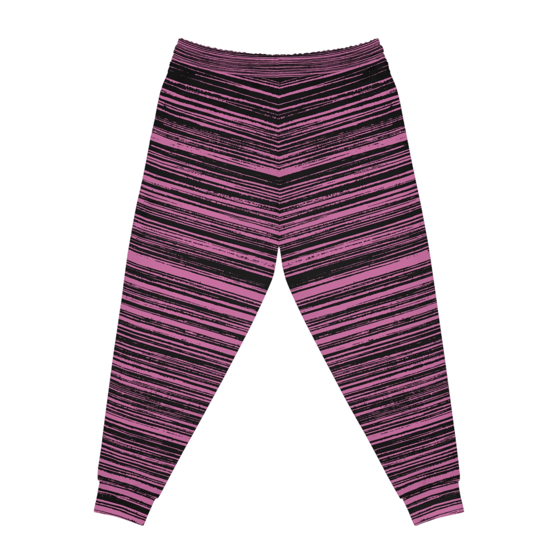 Add flair to your wardrobe with these Black and Pink Striped Joggers. Made from soft, stretchy fabric, they offer comfort and style with bold stripes and versatile design.