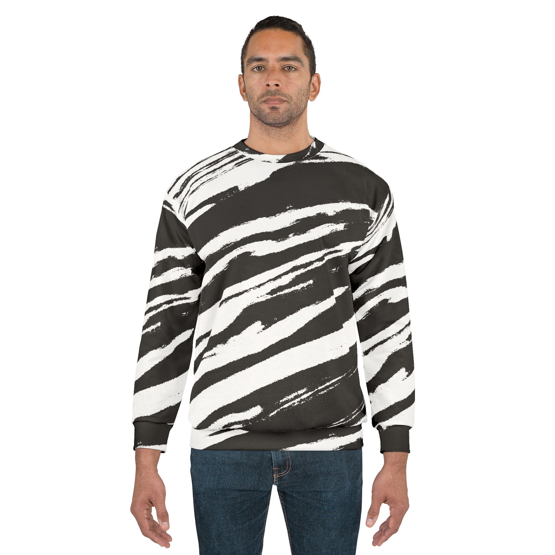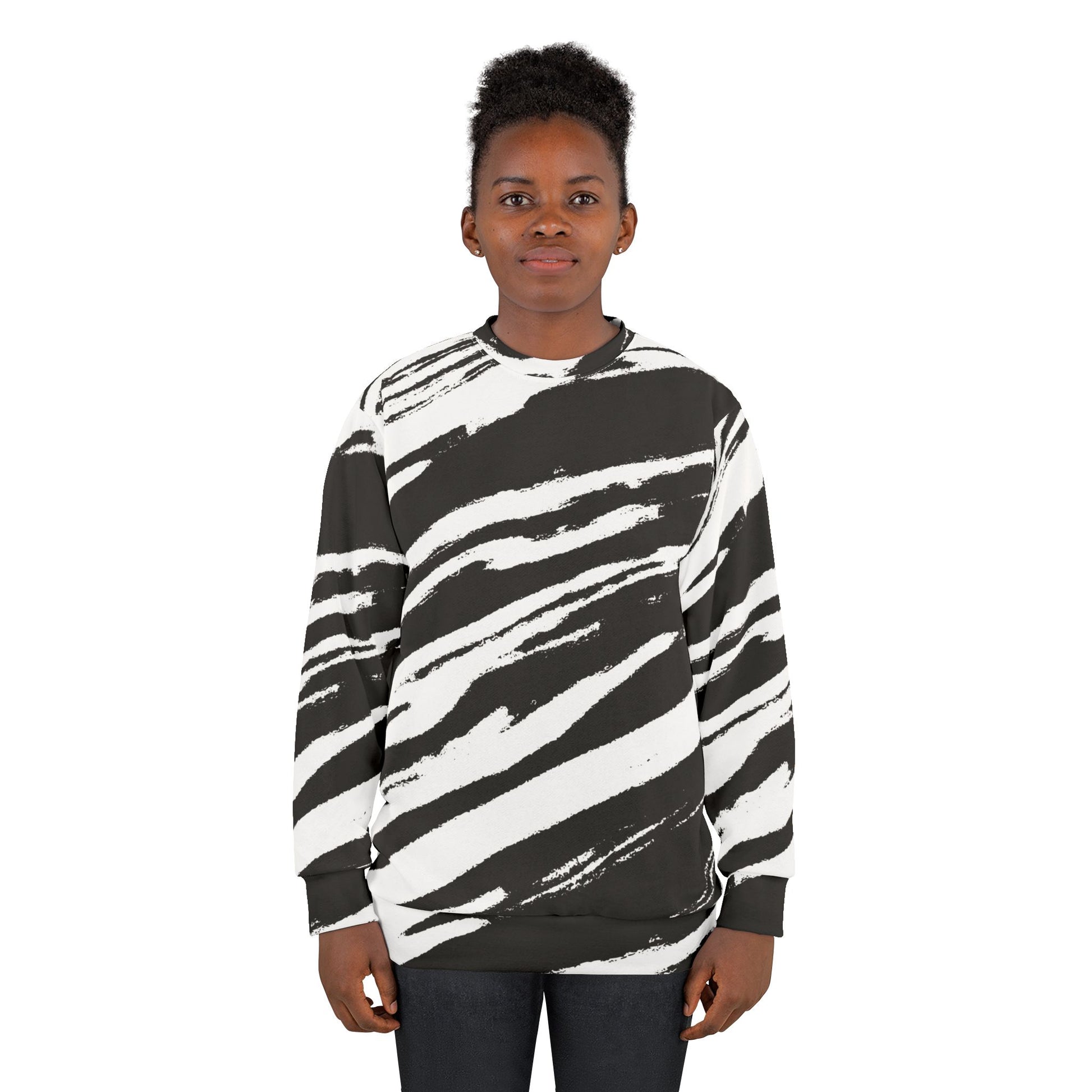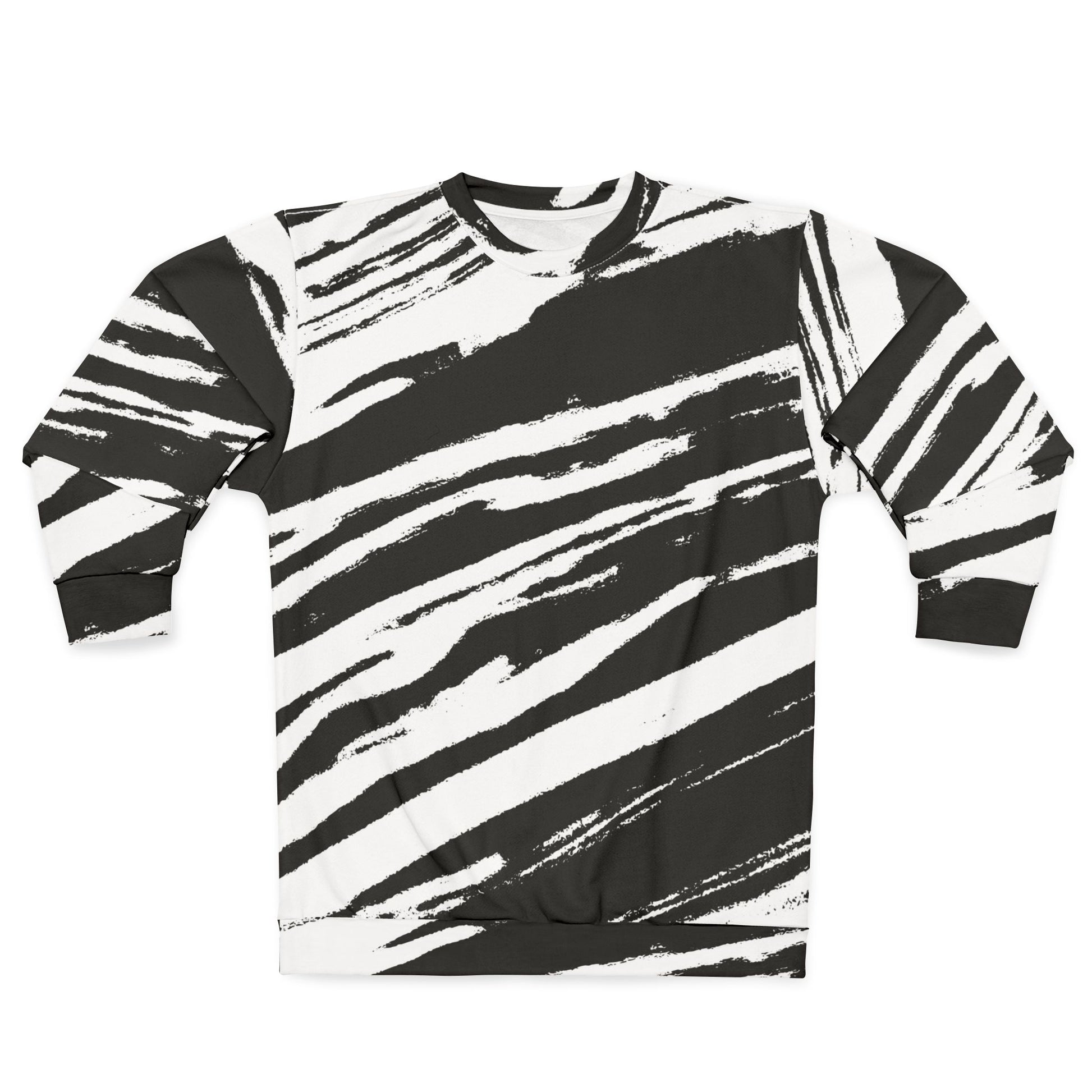 This Sweatshirt features a stylish design of black strokes, giving off a modern and edgy vibe. Perfect for those who love unique and artistic clothing. Ideal for casual wear or lounging at home. Great for those who appreciate creative and bold fashion choices. Suitable for everyday wear, as well as a statement piece for special occasions.