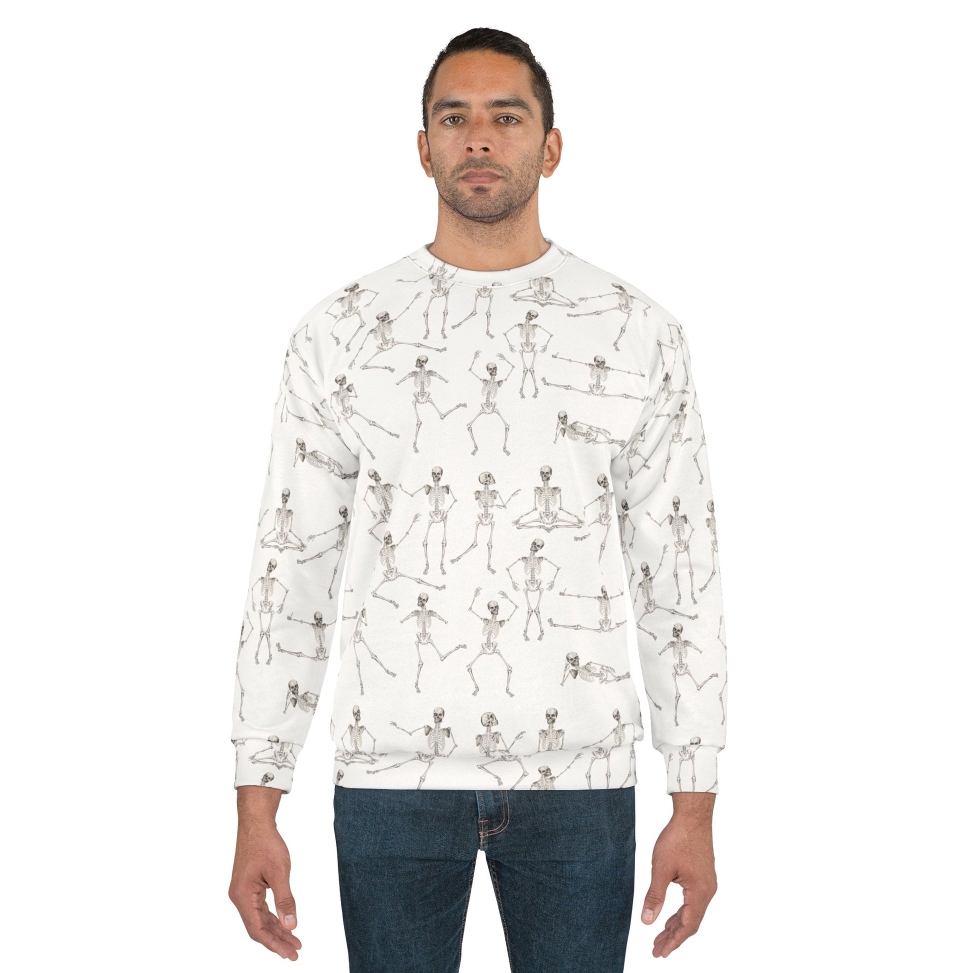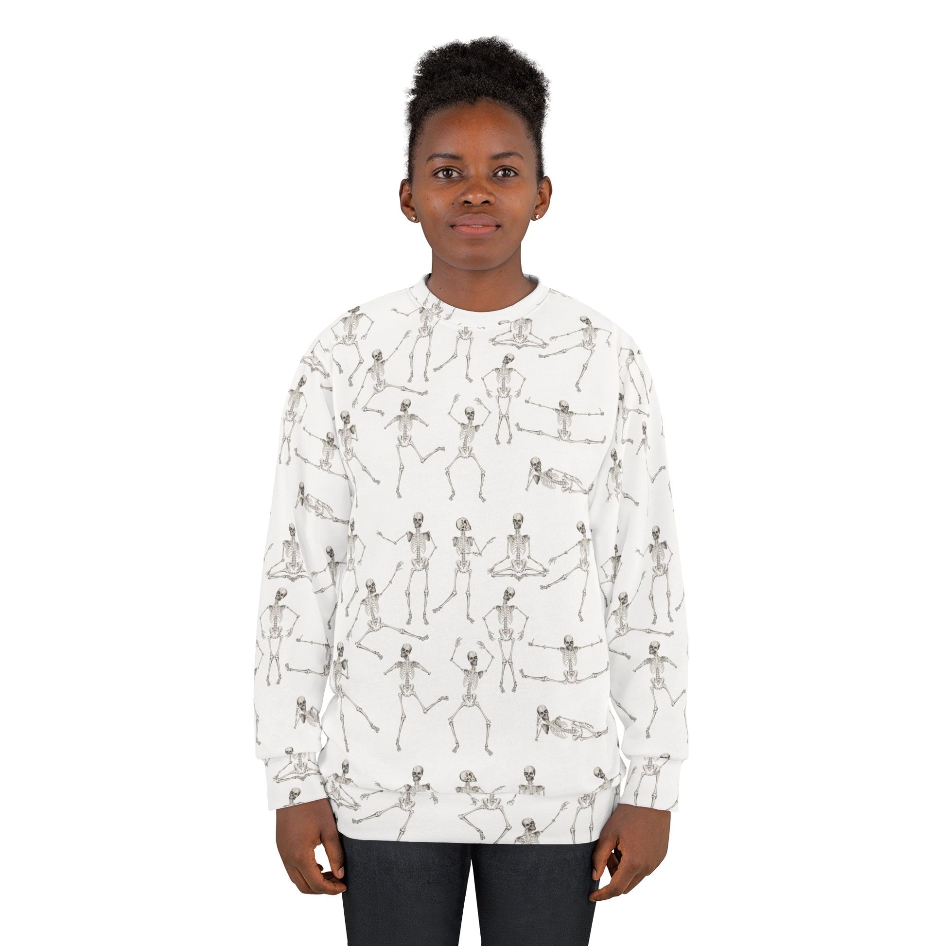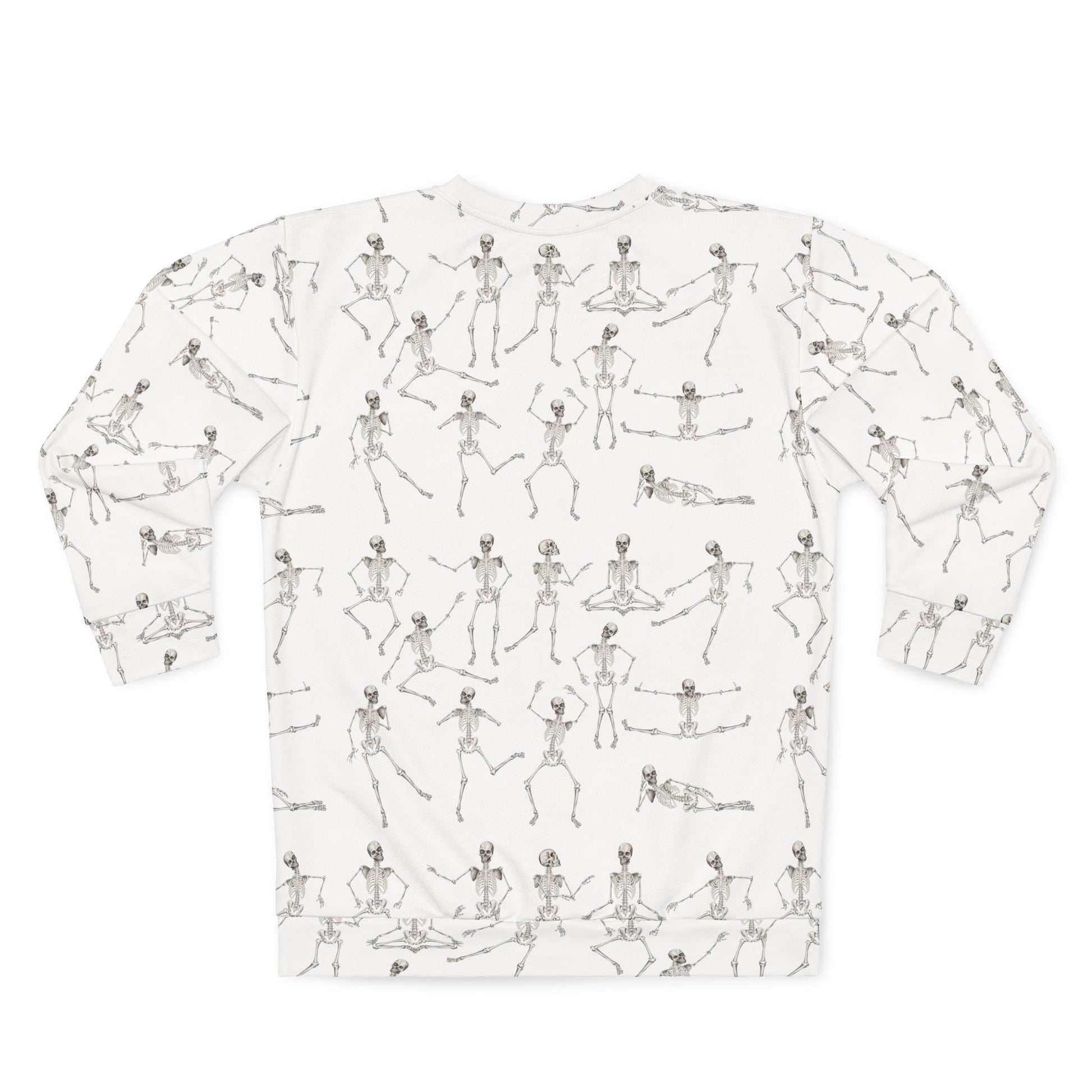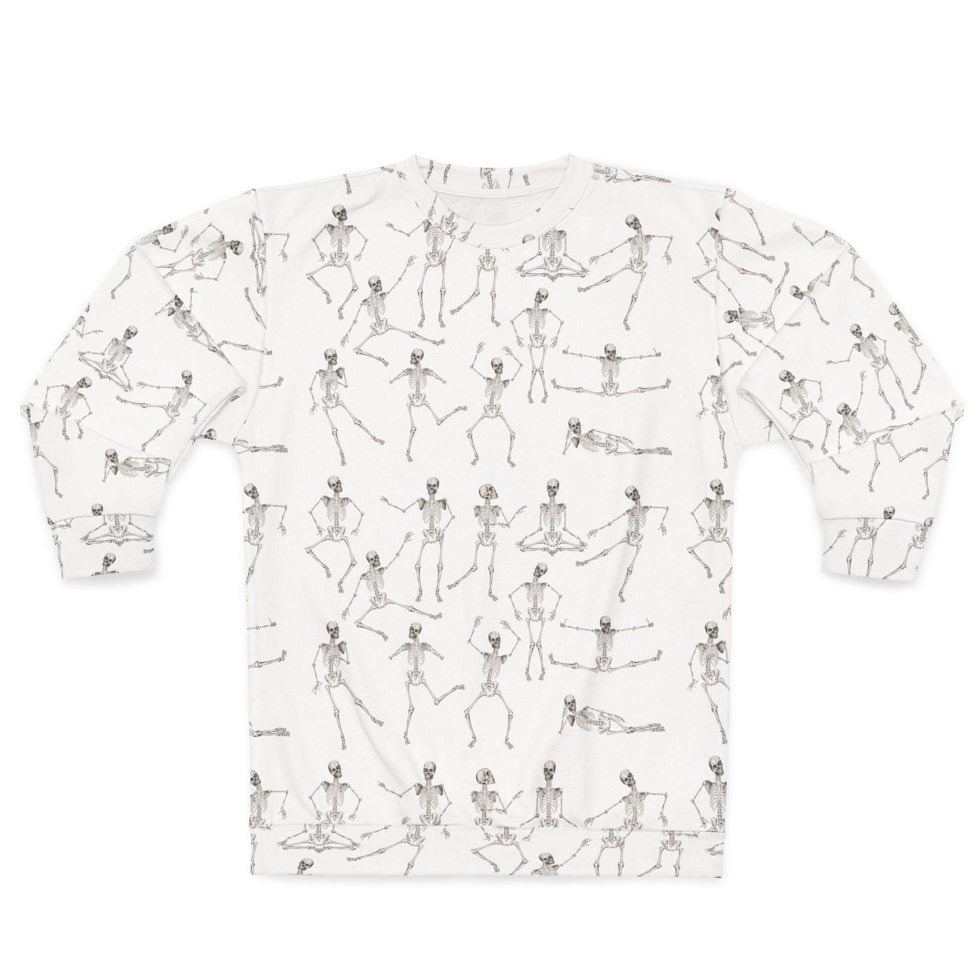 This unisex sweatshirt features a design of dancing skeletons in black and white, giving off a spooky and festive vibe. Perfect for Halloween enthusiasts and fans of all things macabre, this sweatshirt is ideal for casual wear during the fall season and Halloween parties.