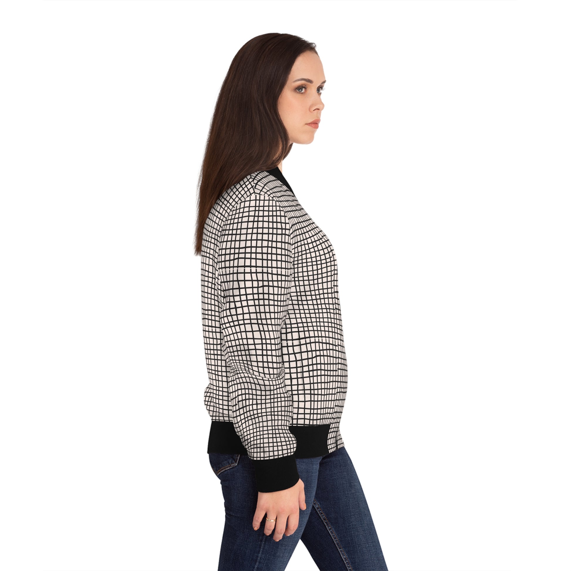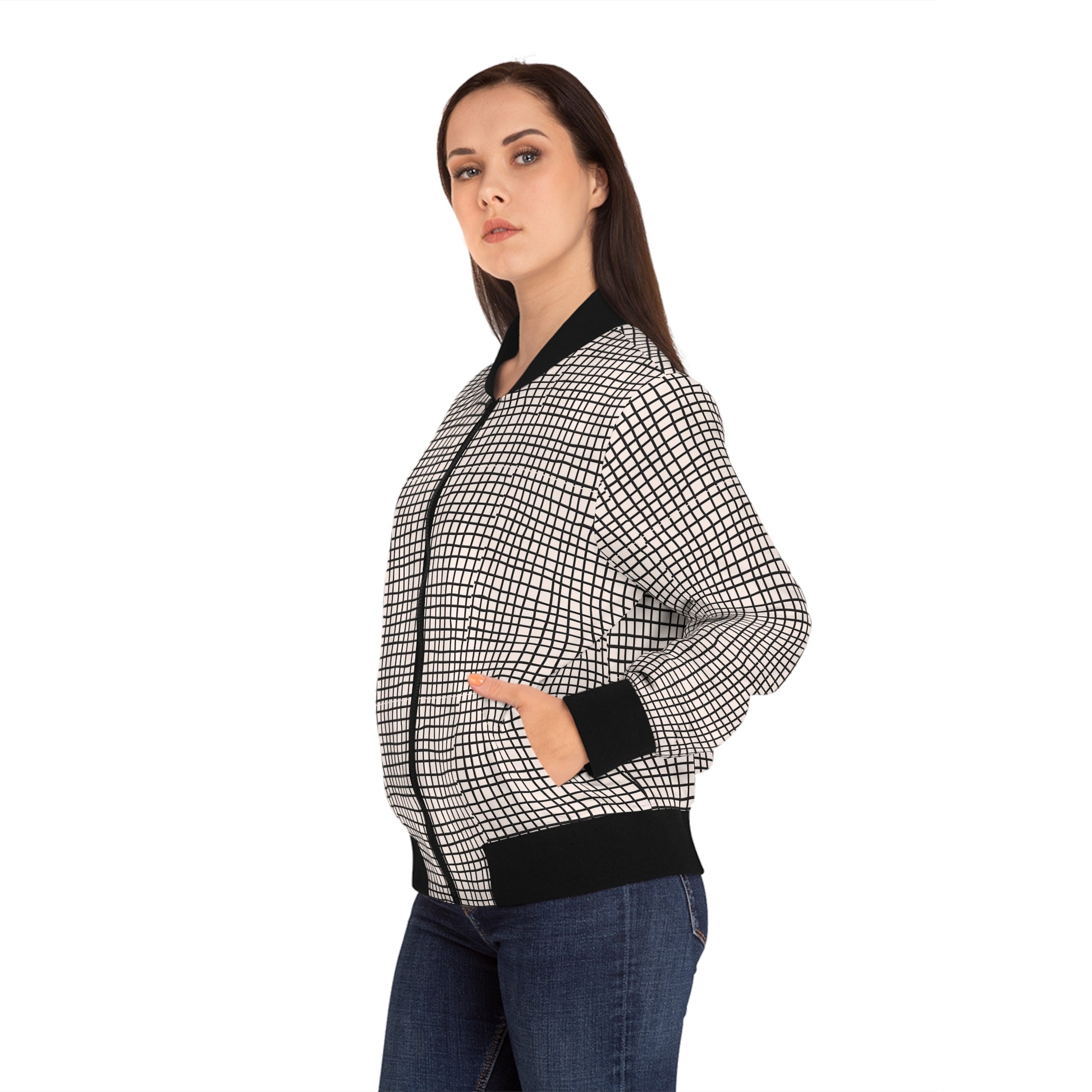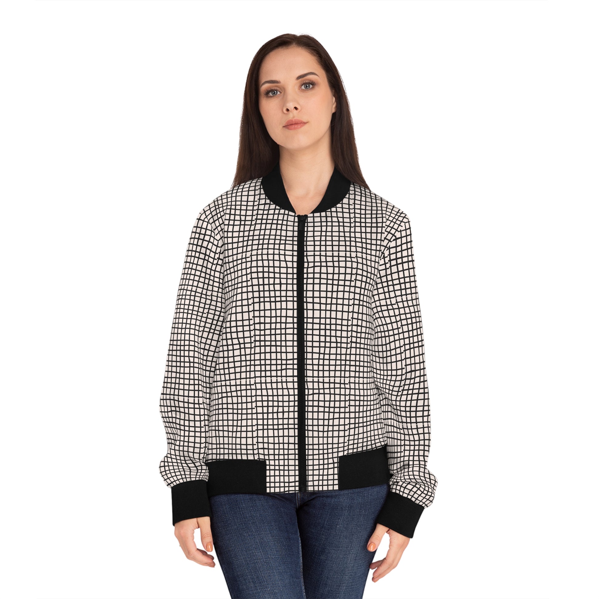 A stylish women's bomber jacket featuring a design of doodle black horizontal and vertical lines on a white background. This jacket exudes a trendy and casual vibe, perfect for everyday wear or a fun night out. Ideal for women who appreciate unique and artistic designs. Perfect for fall and spring seasons, casual outings, and street style fashion.