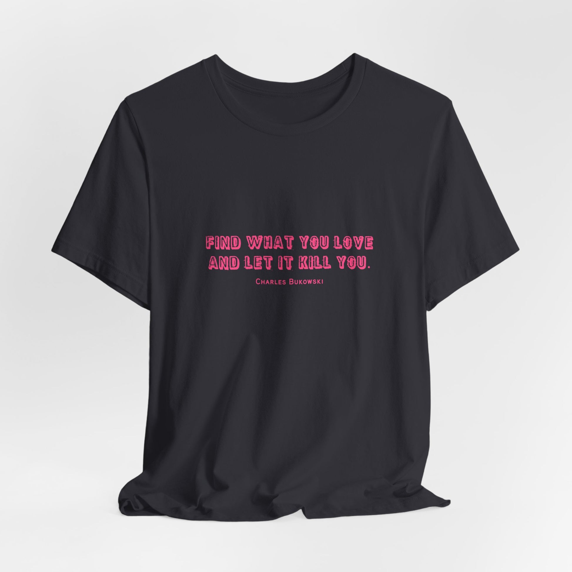 Channel your inner poet with this bold Bukowski T-Shirt, featuring the iconic quote: "Find what you love and let it kill you." Whether you're a literary rebel or just appreciate a good dose of existential truth, this tee makes a punchy statement. Made from 100% Airlume combed and ring-spun cotton, it’s lightweight, soft, and breathable—perfect for both deep thoughts and casual strolls. Dress it up with a blazer or down with denim, and wear your passion on your chest.
