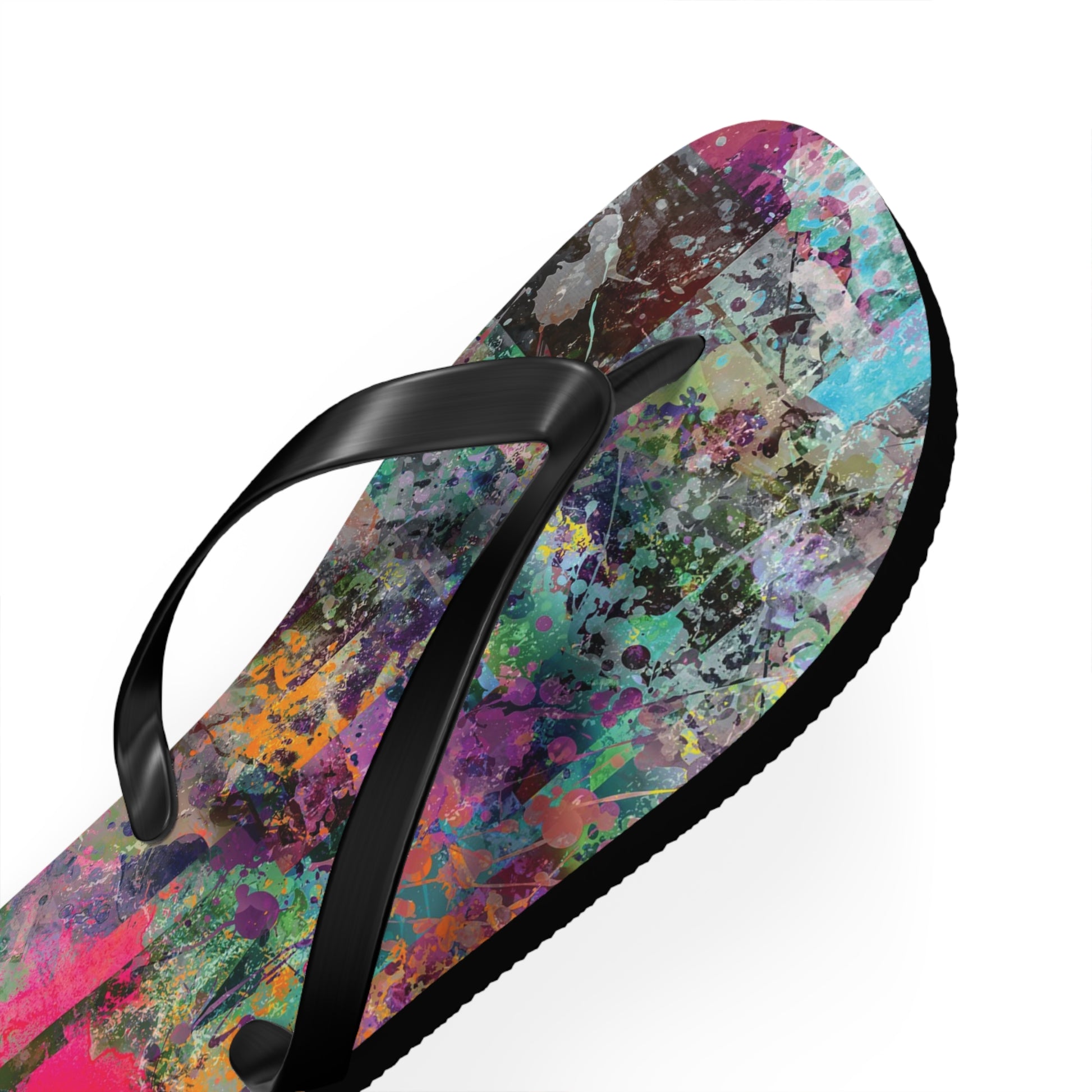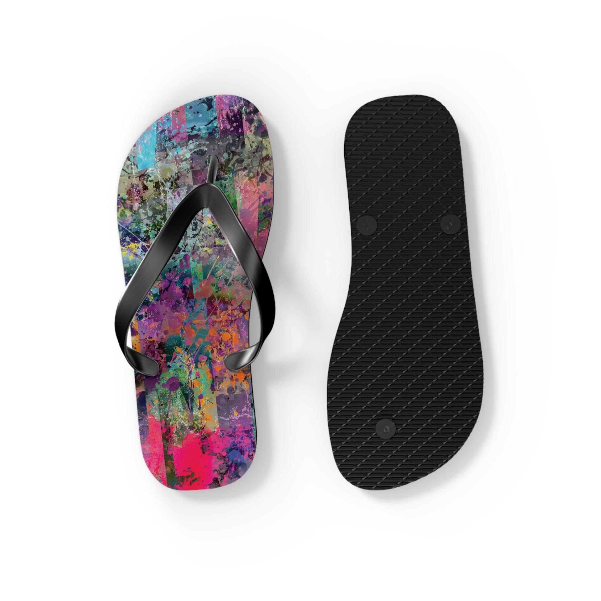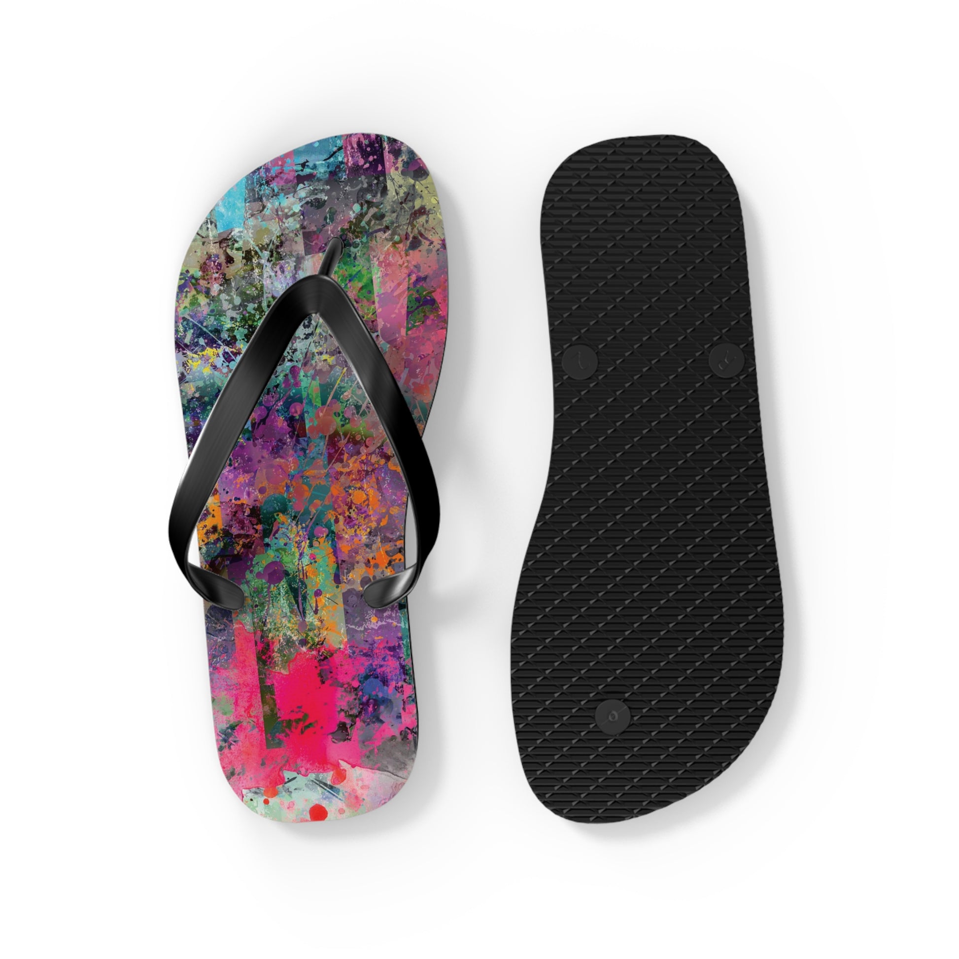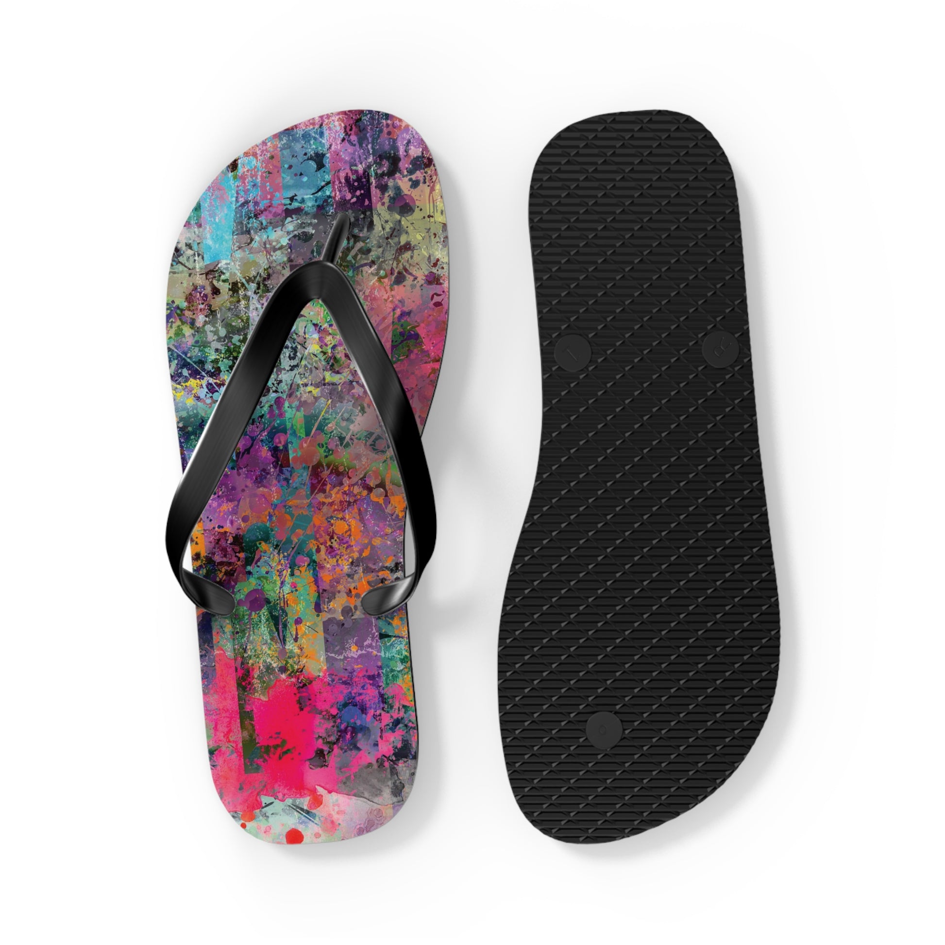 Introducing the Chelsea Flip Flops, where vibrant abstract art meets unparalleled comfort. These flip flops are adorned with a striking, colorful abstract artwork pattern that pays homage to the dynamic art galleries of NYC’s Chelsea neighborhood. Featuring a 5/8" (15 mm) thick EVA sole with a textured bottom, they provide excellent grip and durability for all-day wear. The 100% polyester suede sole cover adds a luxurious touch, while the bold black PVC strap ensures a sleek, modern finish. Perfect for art enthusiasts and city explorers alike, the Chelsea Flip Flops bring a splash of creativity to every step, celebrating the rich artistic spirit of one of New York’s most renowned art districts.