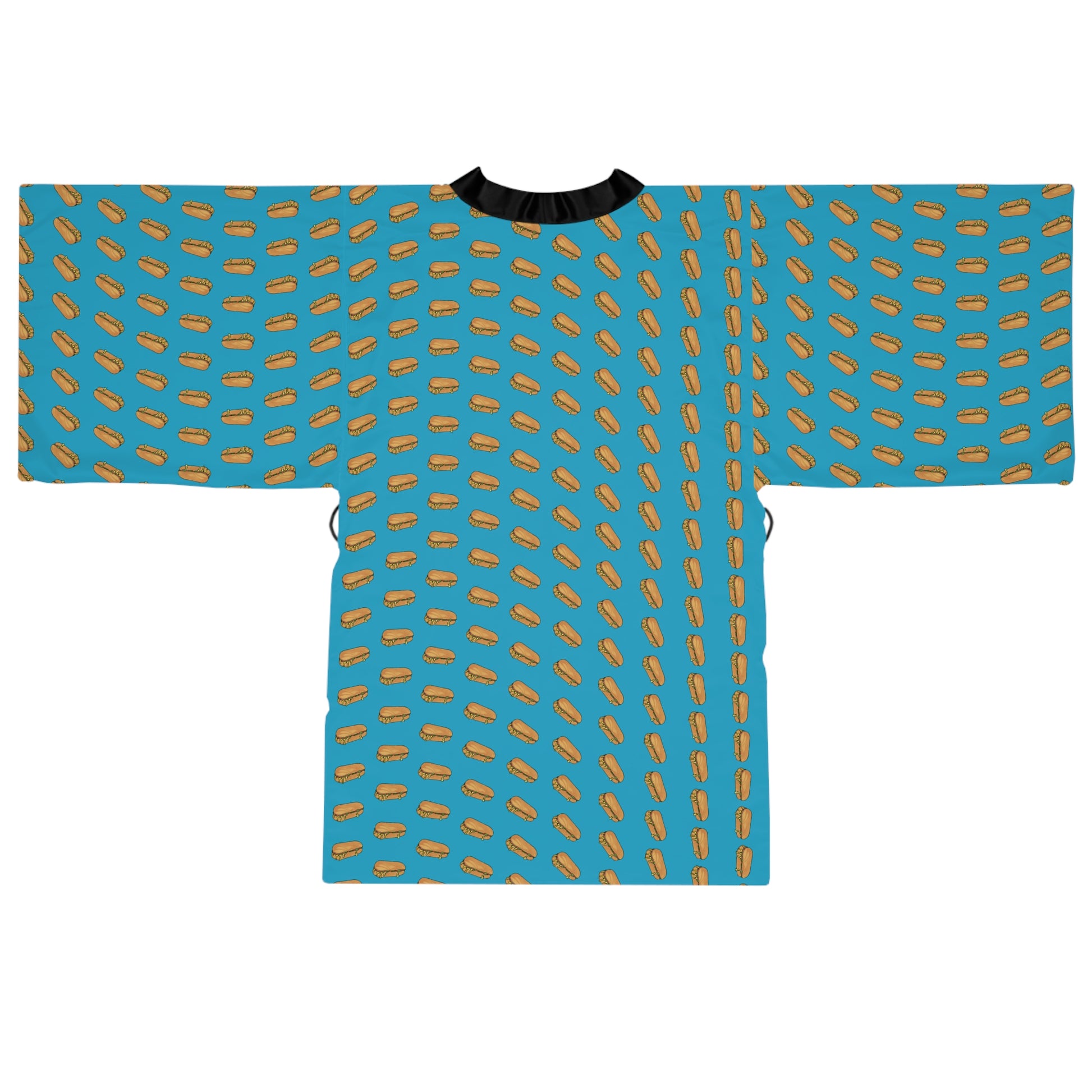 Wrap yourself in New York-inspired comfort with the Chopped Cheese Kimono, a stylish and playful loungewear essential for food lovers! Designed for those who appreciate quirky fashion and bold statement pieces, this lightweight satin kimono robe features a vibrant blue background covered in a fun chopped cheese sandwich print, celebrating the beloved bodega classic. The sleek black trim, wide sleeves, and adjustable waist tie offer a sophisticated yet fun look, making it perfect for lounging at home, streetwear layering, or foodie-inspired events. Whether you're a chopped cheese connoisseur or just love unique prints, this robe is a wearable tribute to NYC’s most iconic sandwich.