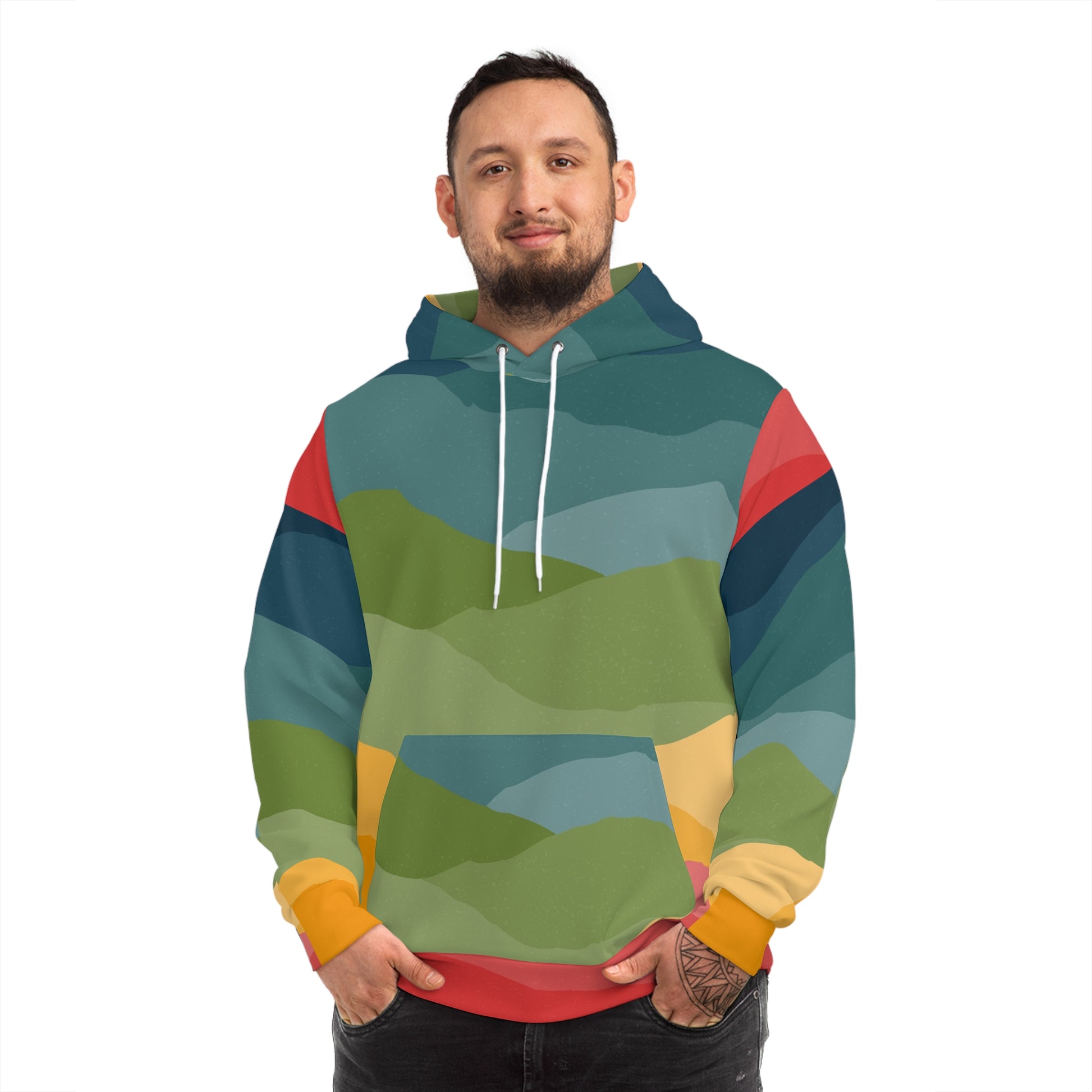 Step into a wearable masterpiece with the Colored Layers Unisex Hoodie, a cozy canvas of abstract landscapes and bold tones. Featuring layered swatches of earthy greens, deep blues, sunny yellows, and vivid reds, this hoodie brings the vibe of a modern art gallery straight into your closet. Whether you're out exploring or vibing at home, it’s the perfect blend of comfort and color therapy.
