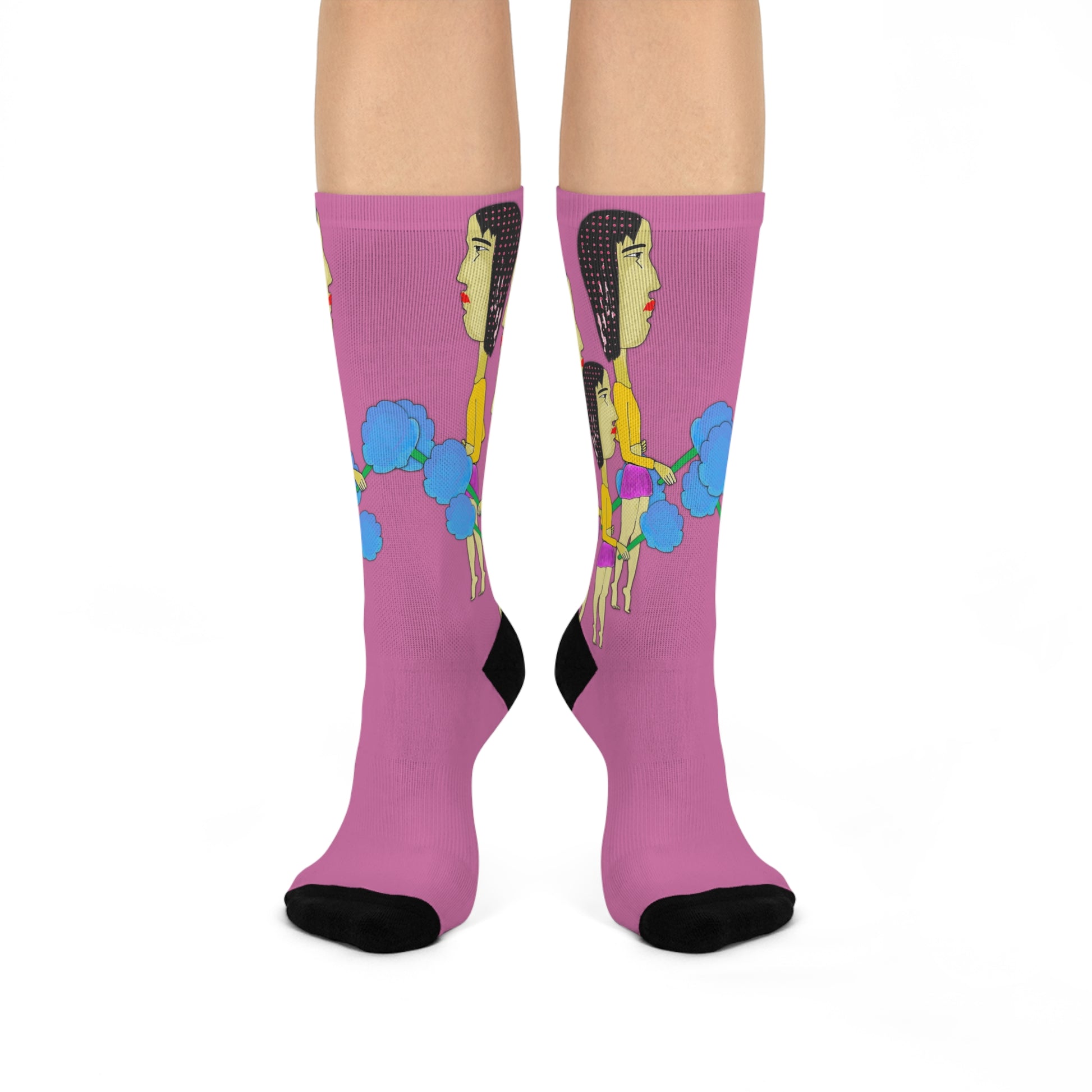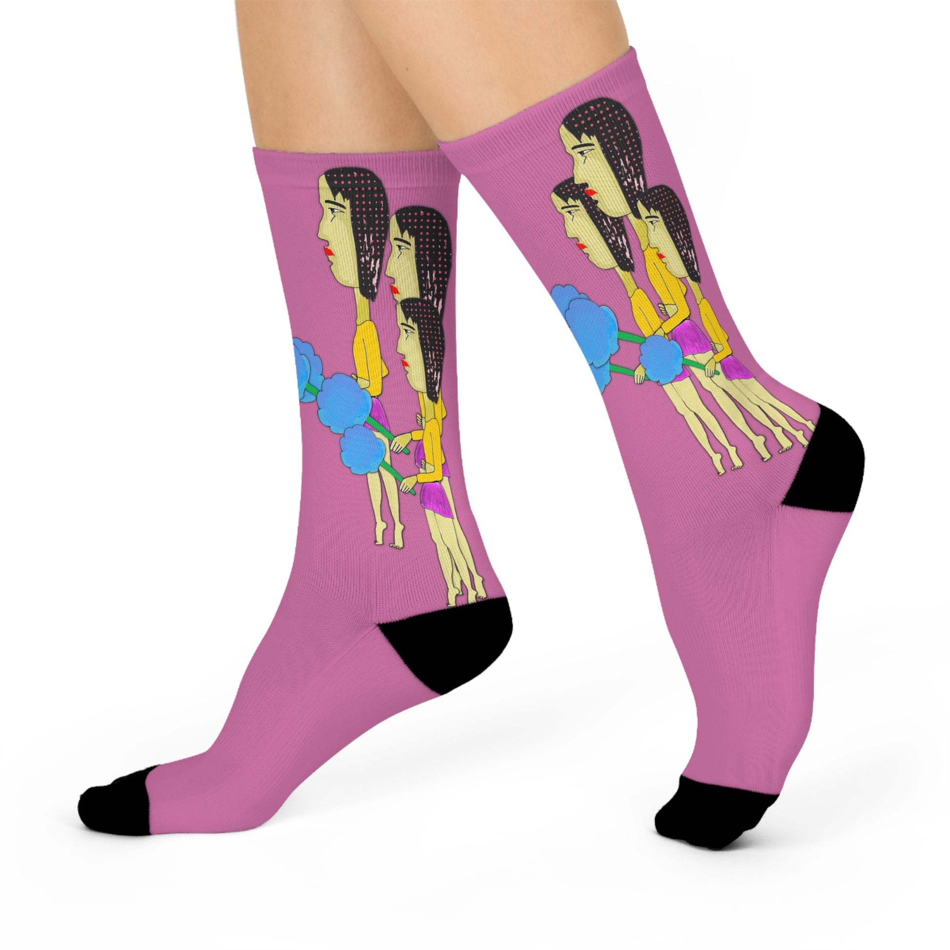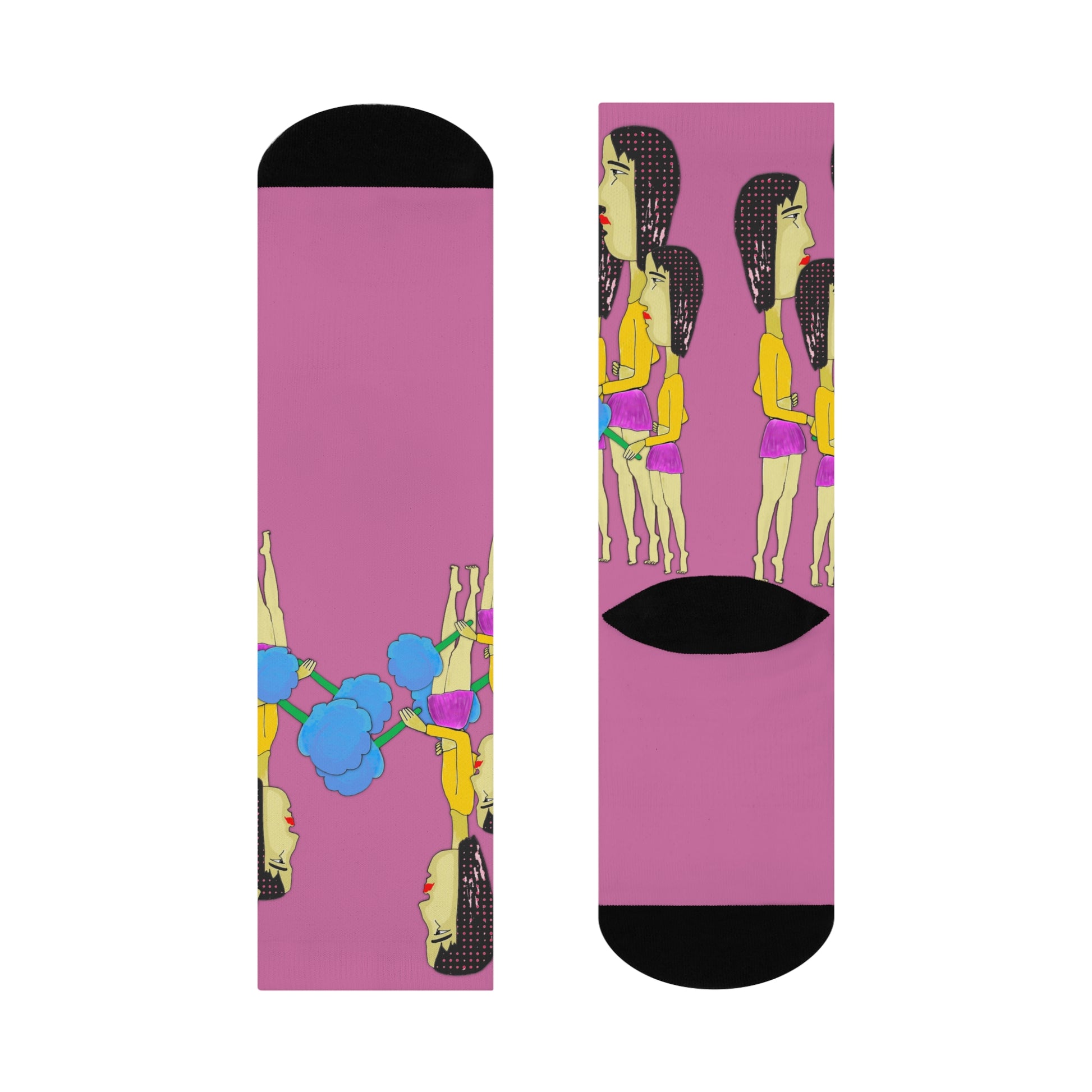 Step up your sock game with these Cotton Candy Crew Socks, featuring a playful, hand-drawn illustration of stylish girls in bold outfits, holding sky-blue cotton candy. The pop-art design wraps around the sock for a statement look from every angle.