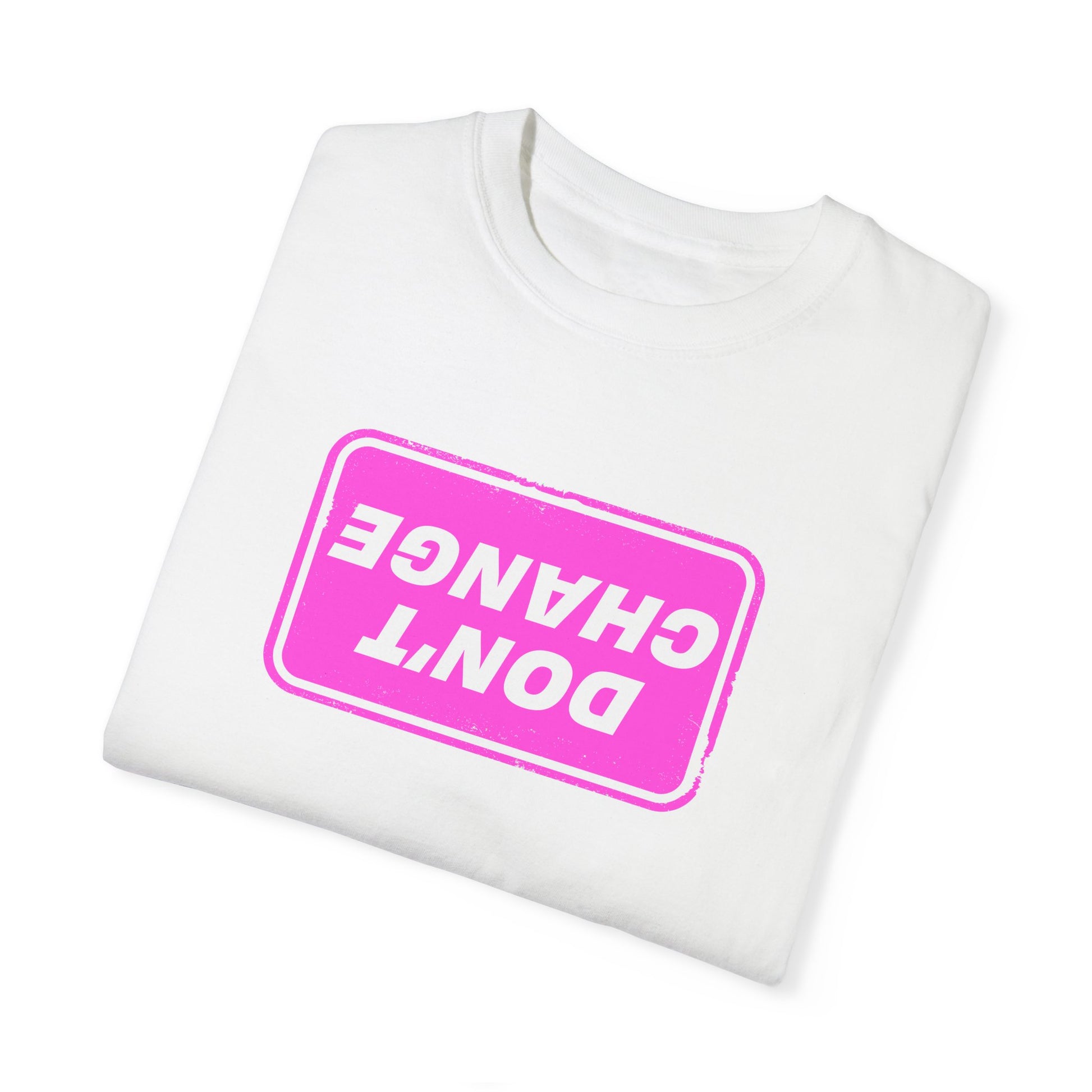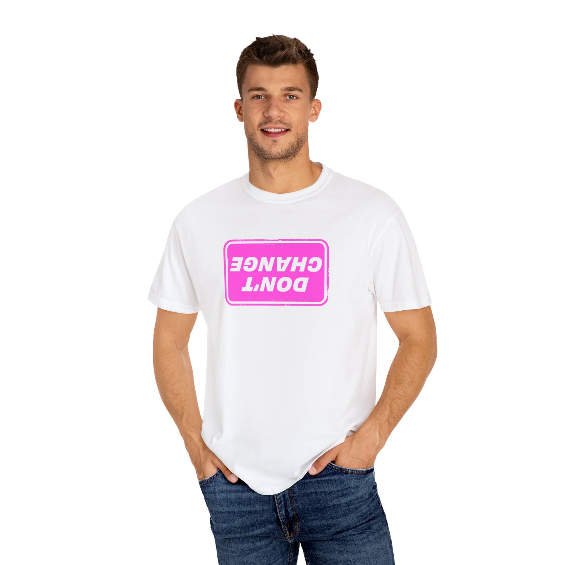 Express yourself with the Don't Change T-Shirt, a powerful statement piece designed for those who stay true to themselves. Featuring a vibrant pink upside-down "Don't Change" graphic, this unisex t-shirt is perfect for making a bold yet stylish impression. Crafted from soft, high-quality cotton, it offers breathable comfort for everyday wear. Whether paired with jeans for a casual streetwear look or layered for a trendy outfit, this tee is the ultimate conversation starter. Stay authentic, stay bold—don't change.