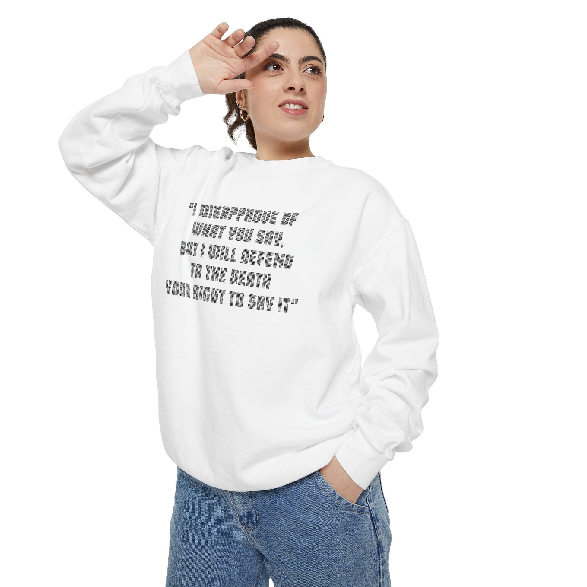 Make a bold statement in comfort with the Freedom of Speech Unisex Sweatshirt. Crafted from an 80% cotton and 20% polyester blend, this sweatshirt feels luxuriously soft while offering everyday durability. The front features the timeless quote “I disapprove of what you say, but I will defend to the death your right to say it,” reminding everyone of the importance of free expression. Designed with a relaxed fit for all-day wear, this piece is as cozy as it is powerful. Available in a variety of colors, it pairs easily with jeans, joggers, or layered looks. Optional embroidery on the left chest adds a subtle, personalized touch. Whether you’re speaking out, lounging at home, or stepping out in casual style, this sweatshirt combines meaning and comfort in one wearable statement.