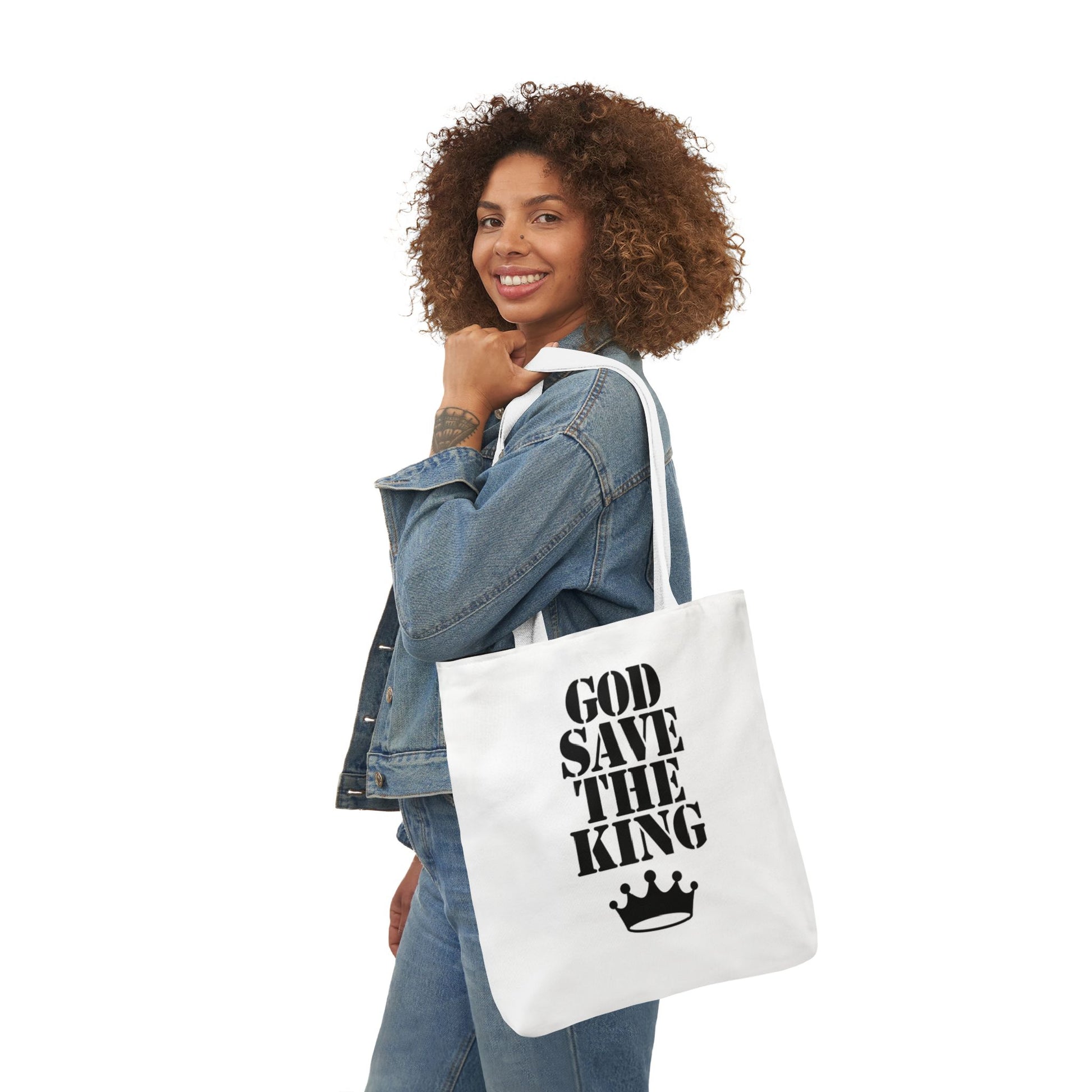Introducing the God Save The King Tote Bag - the perfect combination of style and functionality. Made from lightweight yet durable polyester canvas, this tote bag can easily hold all your essentials without weighing you down. The sleek black lining adds a touch of sophistication, while the comfortable straps come in five beautiful colors to match your personal style. Measuring 18" × 18'', this tote bag is spacious enough for all your needs, whether you're heading to the beach or running errands around town. Say goodbye to flimsy, uninspiring tote bags and upgrade to the God Save The King Tote Bag today.