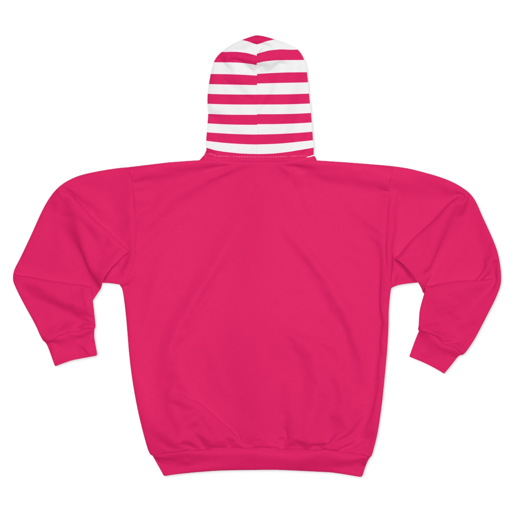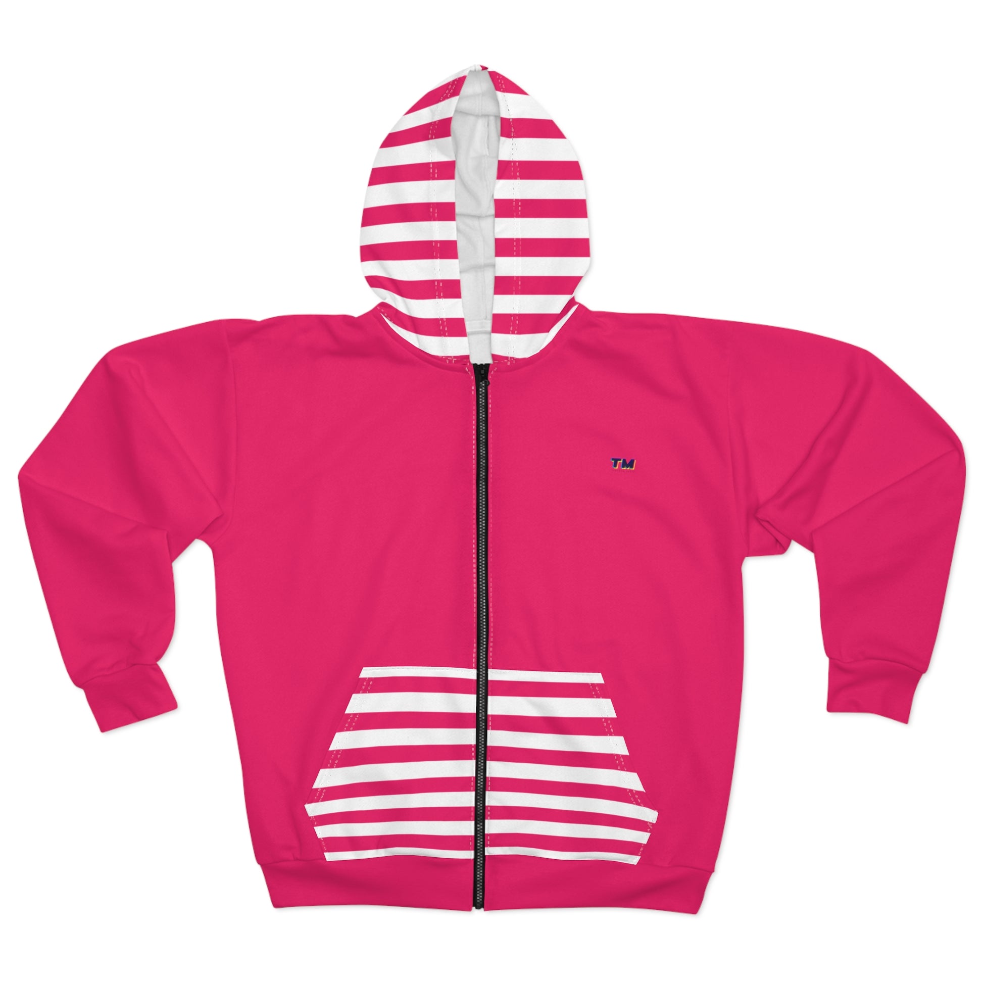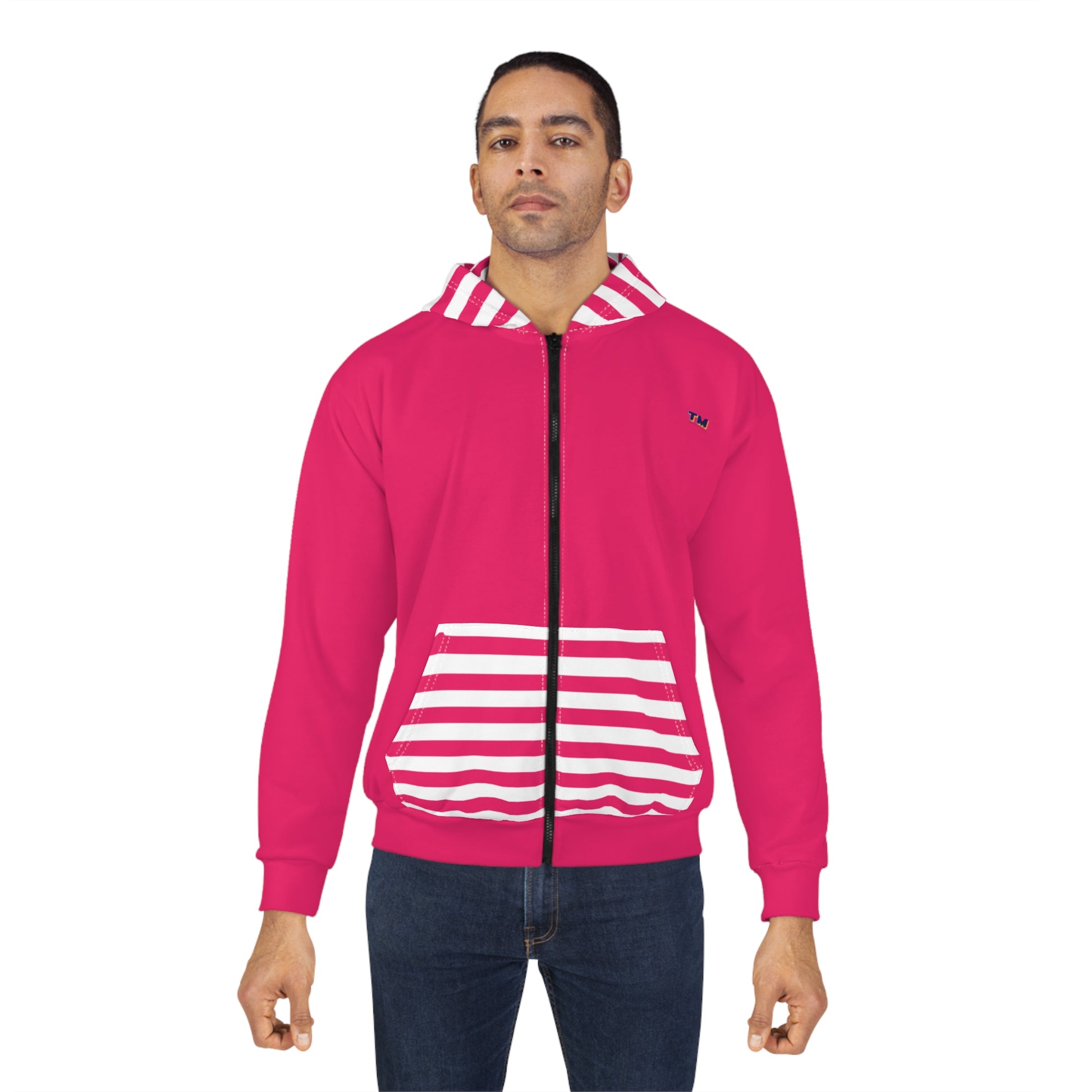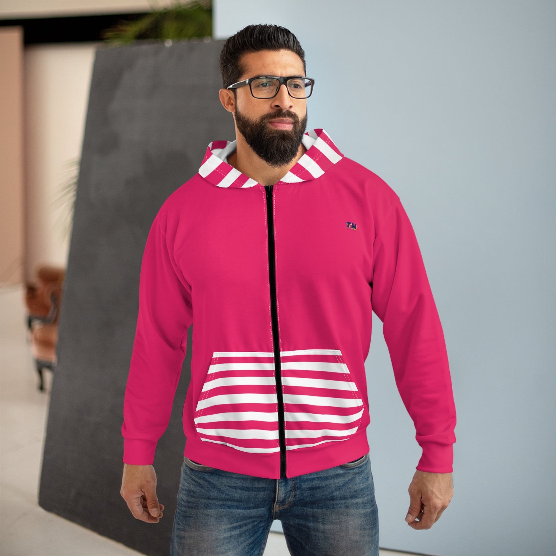 A zipped hoodie in plain Hot Red color with red stripes on pockets and hood. This hoodie is perfect for those looking to stay warm and stylish during the colder months. It is ideal for individuals who appreciate bold and vibrant designs. This hoodie is great for Christmas, Valentine's Day, or just casual wear.