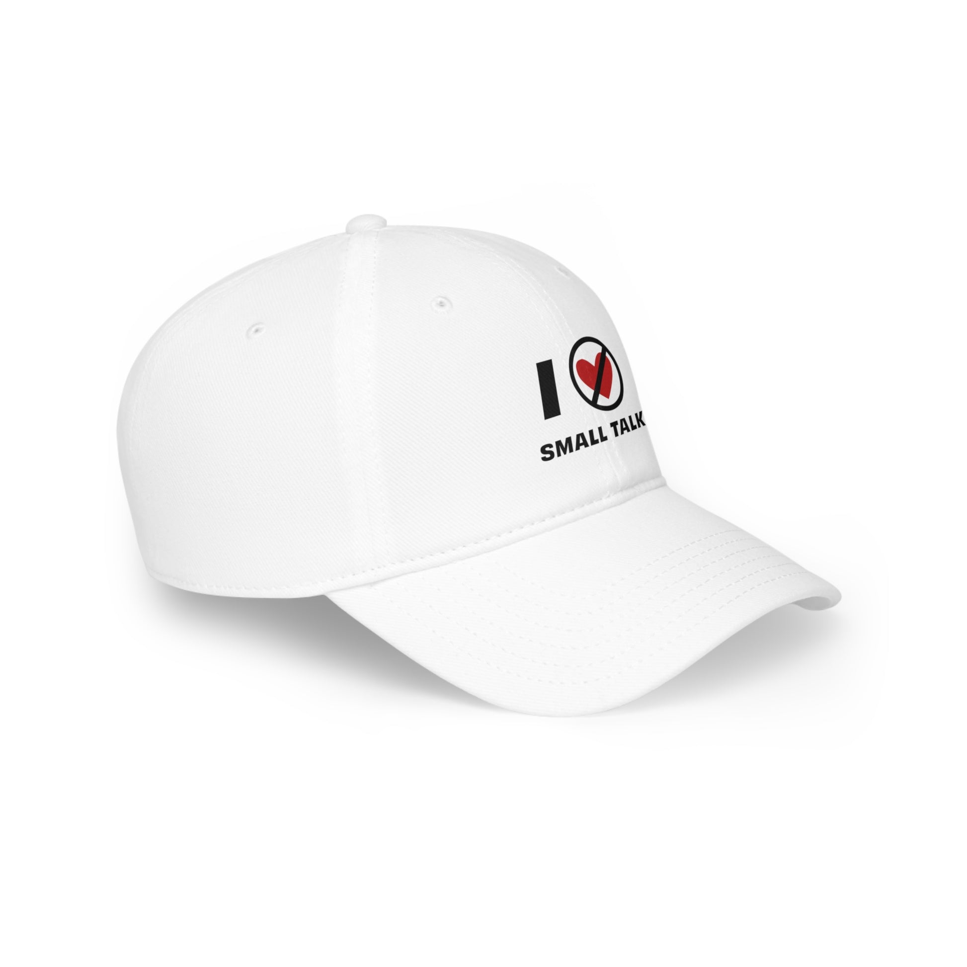 Introducing the ultimate wardrobe icon - the I Hate Small Talk baseball cap! Made with 100% cotton twill, this 6-panel, structured cap features the signature low-profile look that has made it famous both on and off the field. It has an Adjustable Velcro® closure designed to fit comfortably and securely. Say goodbye to small talk and make a bold statement with this cute hat.