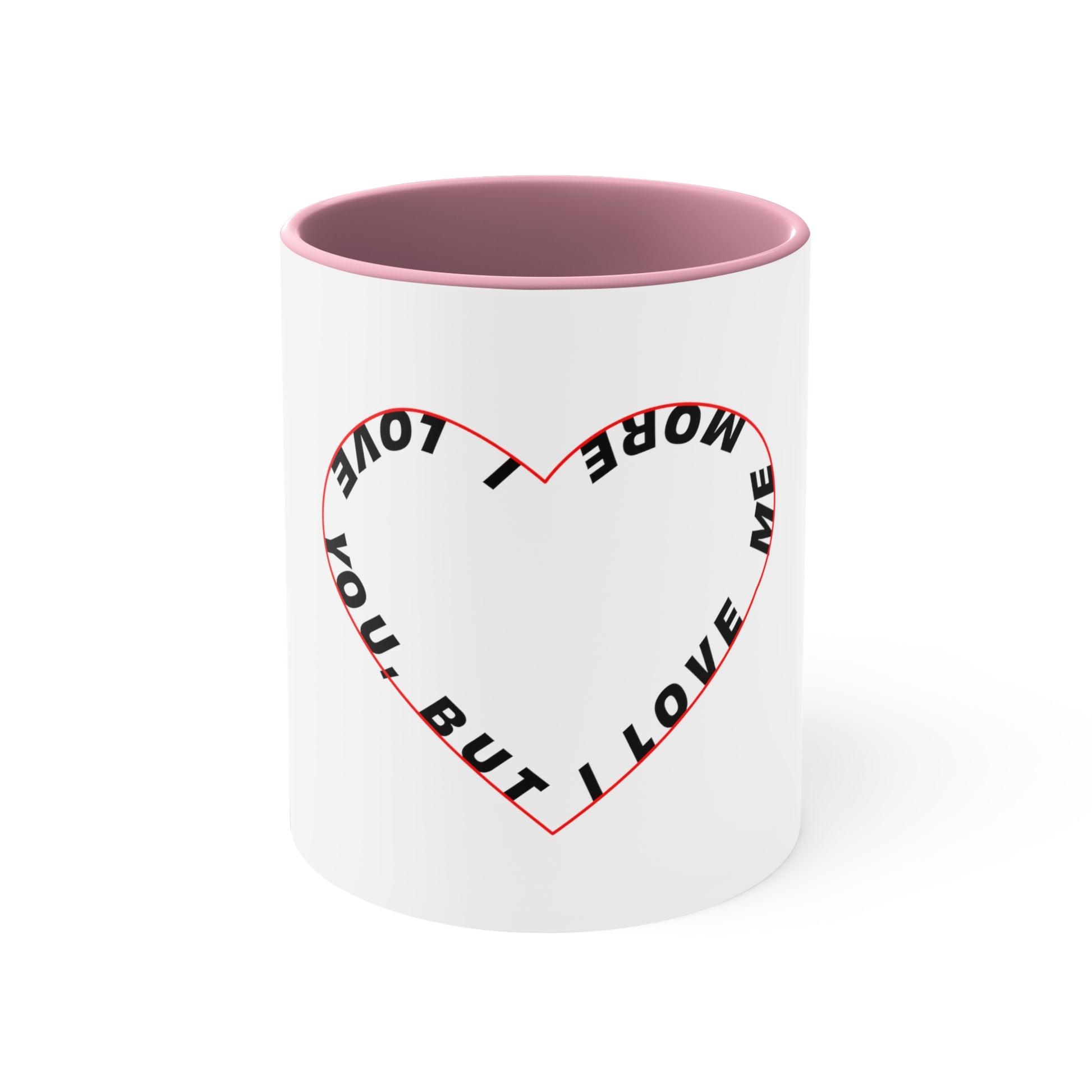Introducing our I Love You But I Love Me More Coffee Mug, part of our Singlehood collection. This 11oz mug is the perfect companion for your morning cup of coffee, featuring a comfortable C-Handle and a colored interior and handle for added character. Made of white ceramic, this mug is both lead and BPA-free, so you can enjoy your favorite beverage worry-free. Whether you're celebrating your independence or simply want to make a statement, this mug is the perfect addition to your collection. Order yours today and embrace the sentiment of self-love with every sip.
