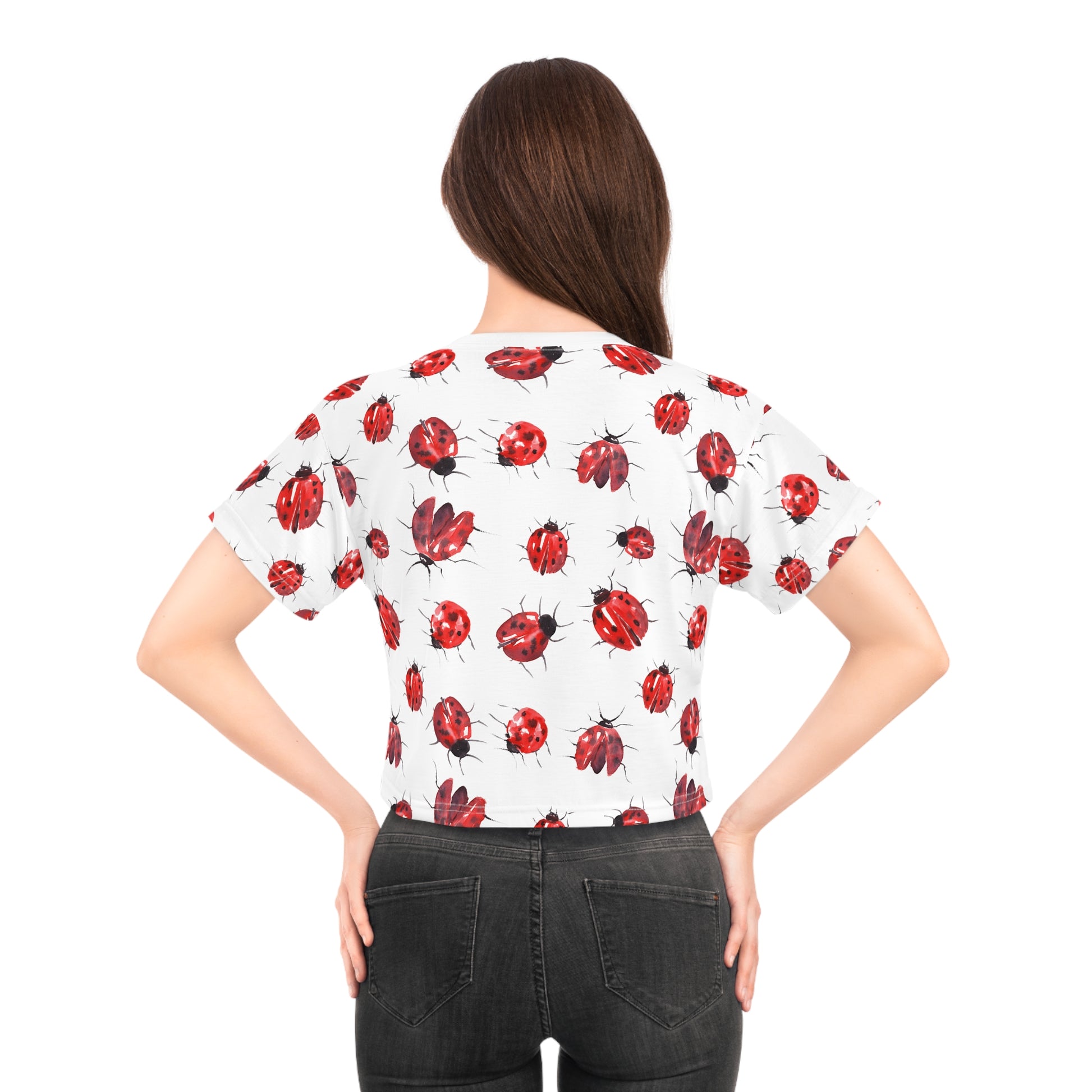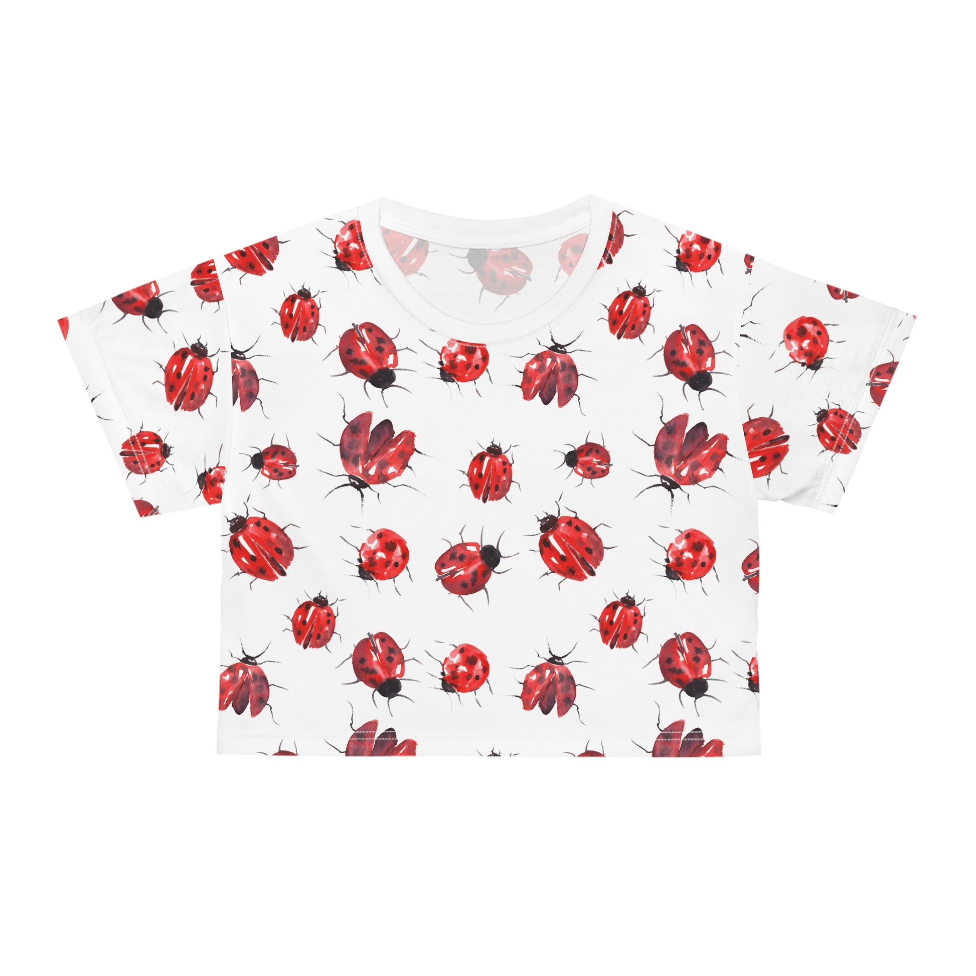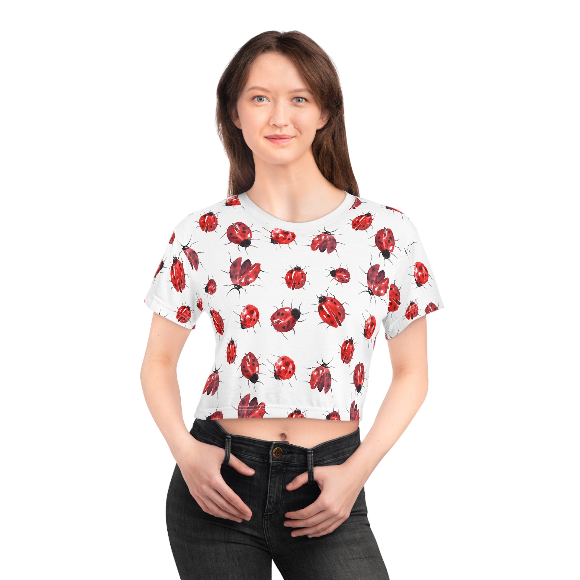 Bring a bit of luck and a whole lot of charm to your outfit with this adorable Ladybug Crop Top. Covered in a playful pattern of bright red ladybugs on a white background, this tee adds a cute twist to your everyday look. It's a fun and fresh way to express your love for nature, whimsy, and bold prints—perfect for spring vibes and standout style moments.