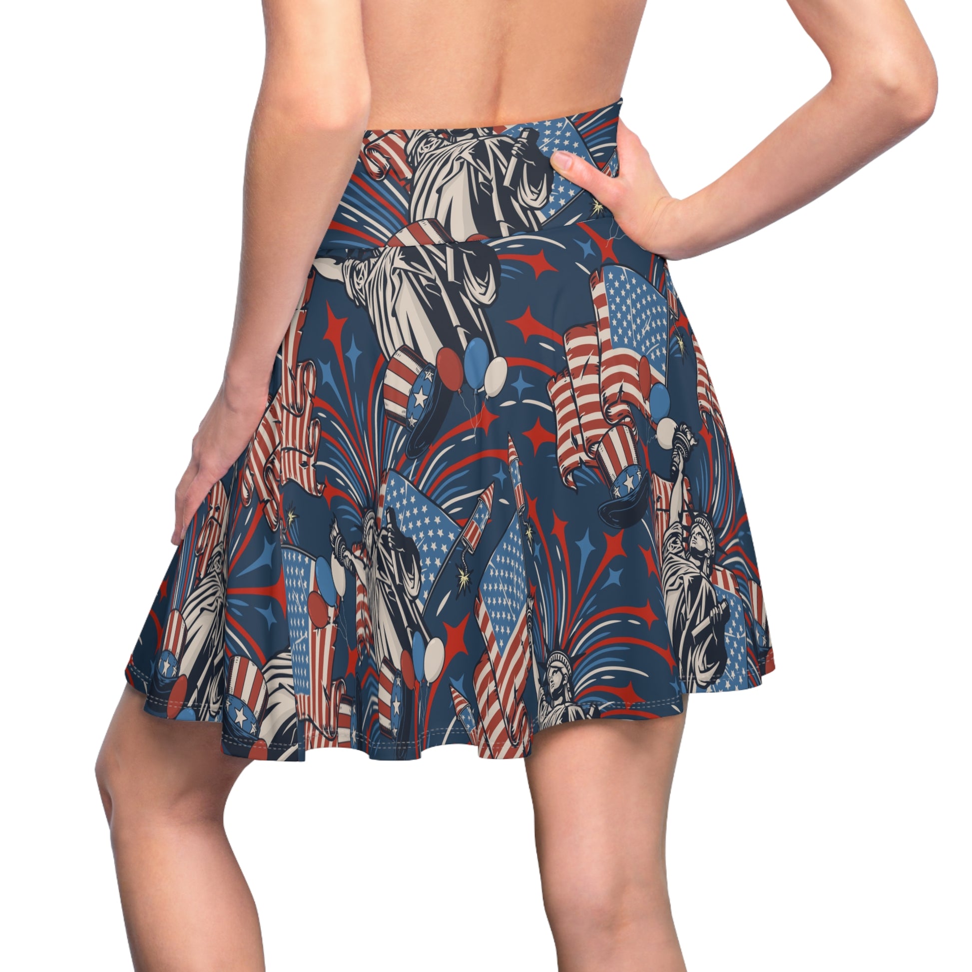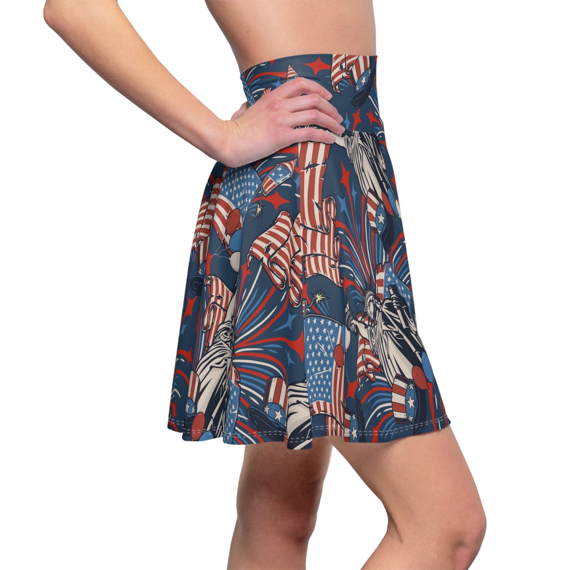 Unleash your inner patriot with the "Land Of Th Free" Skirt! Adorned with a bold pattern of iconic American symbols, this skirt is a sartorial salute to freedom and style. Crafted from a blend of 95% polyester and 5% spandex, it combines comfort and stretch with a playful print of stars, stripes, and eagles. Whether you're hitting a summer festival or strolling through city streets, the "Land Of Th Free" Skirt will have you feeling like a star-spangled sensation. Its flattering cut and spirited design make it not just a fashion statement, but a celebration of the land of the brave and the home of the chic. Wear it proudly and let your outfit do the talking!