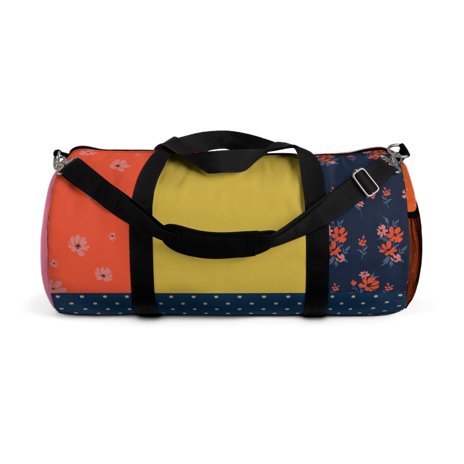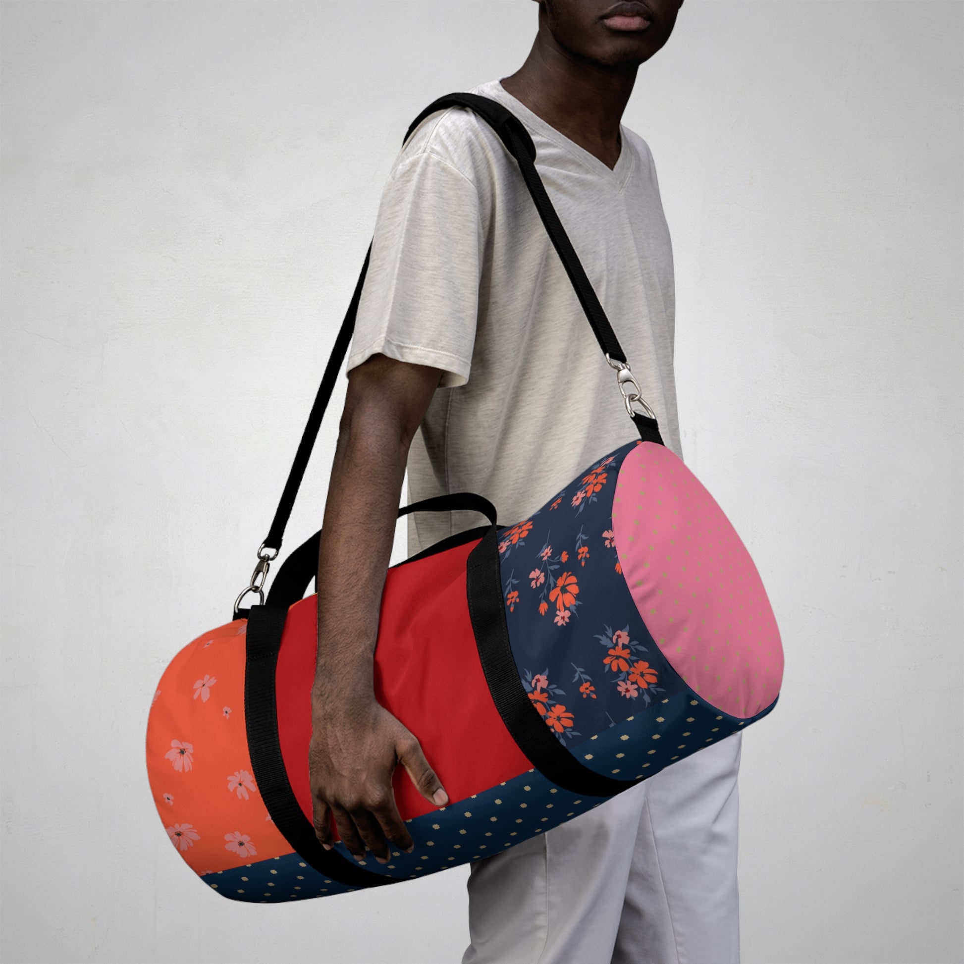 The Midnight Bloom Patchwork Duffel Bag fuses floral elegance with bold color blocking. Featuring vibrant red, navy, and coral tones with scattered floral accents and subtle polka dots, this duffel feels both playful and refined. Perfect for those who love mixing sporty utility with artistic design. With a spacious interior and durable black strap, this bag is built for getaways, gym sessions, or elevating your daily essentials.