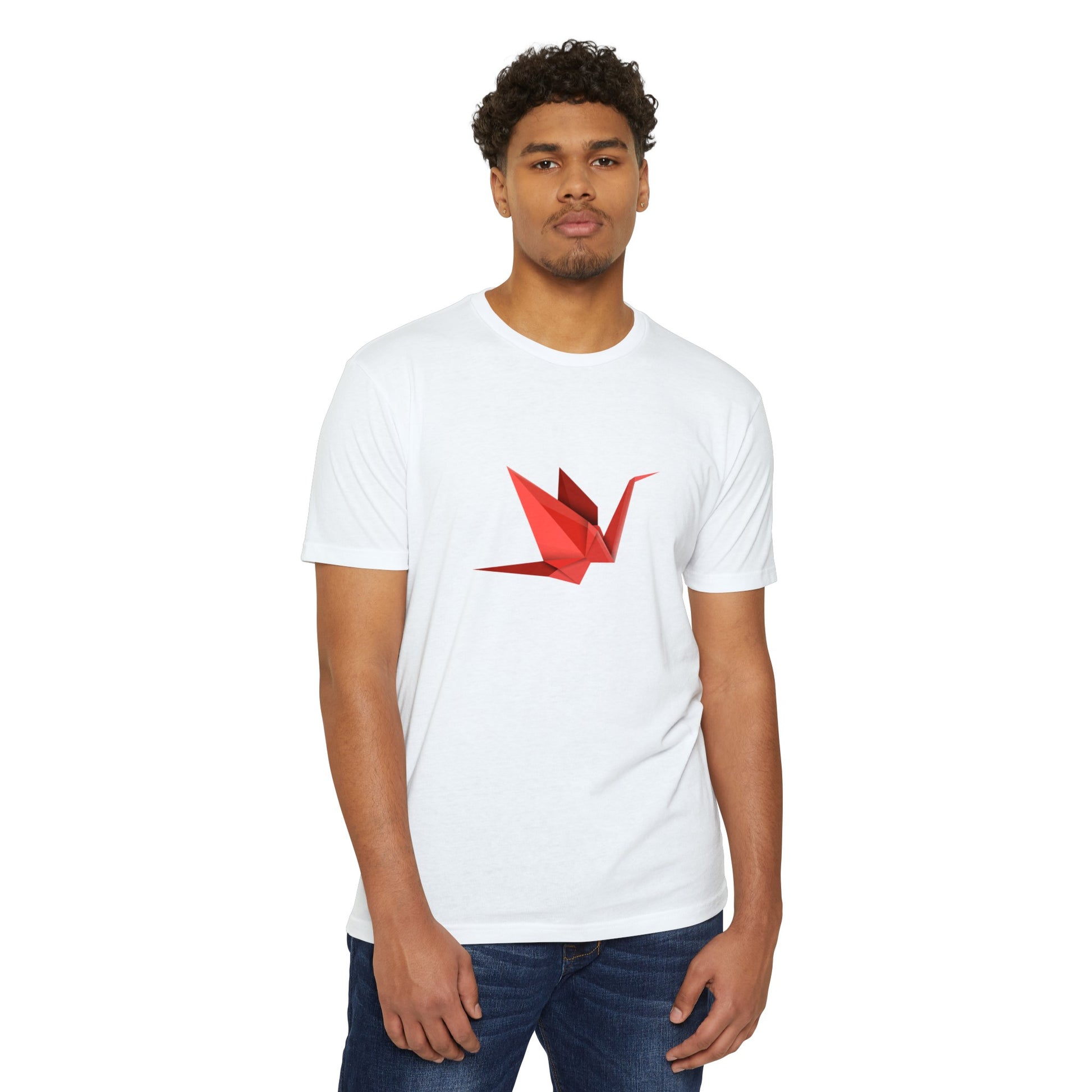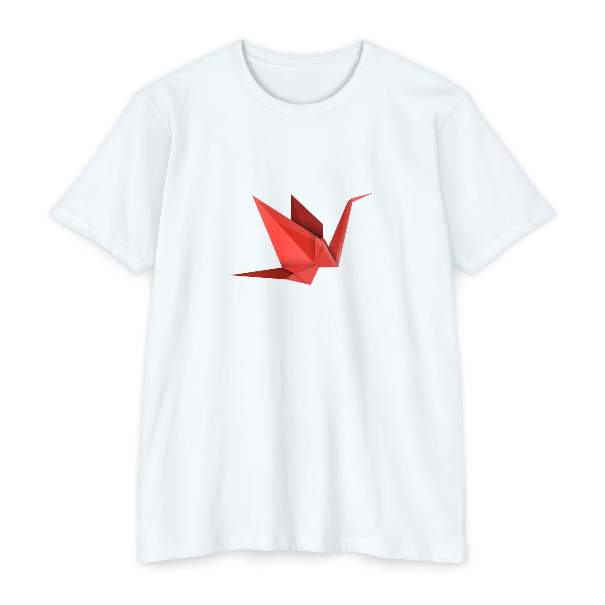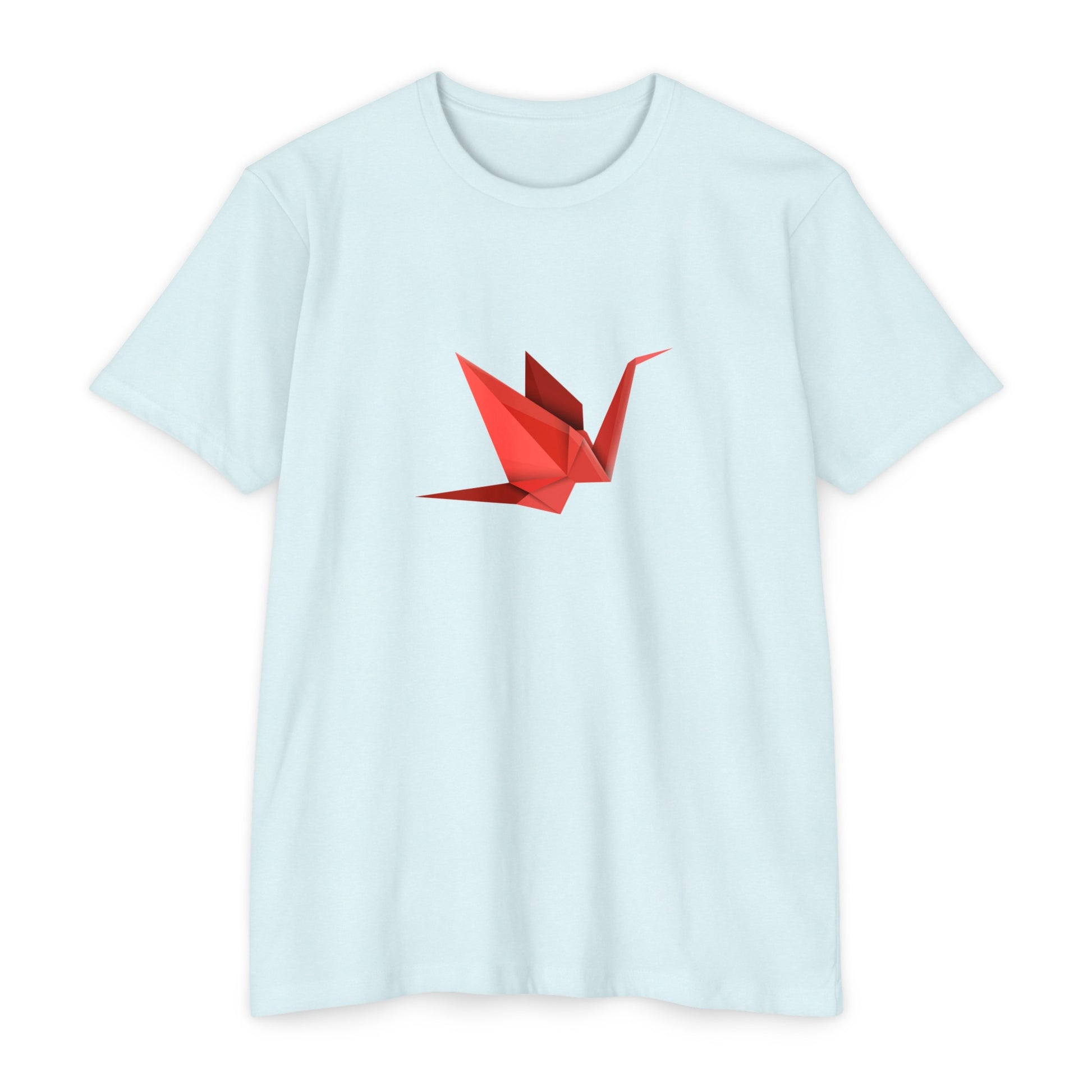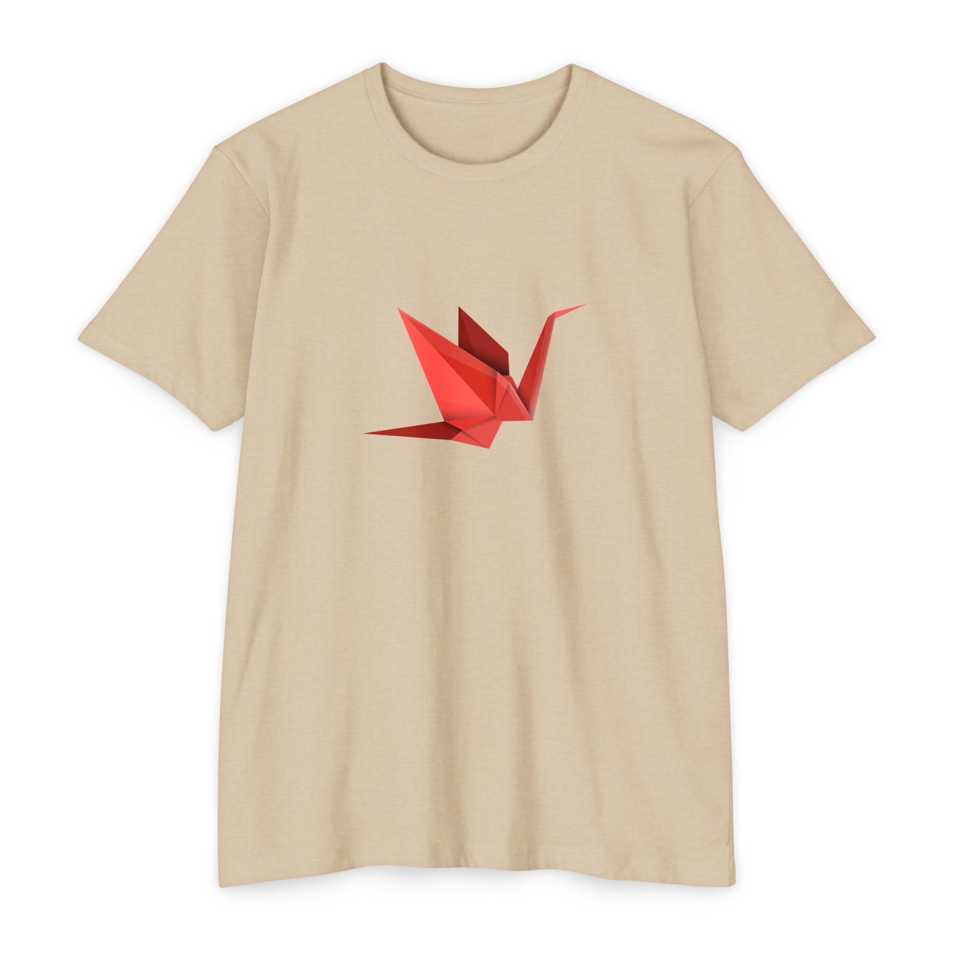 ntroducing the "Origami Crane" T-Shirt, a celebration of the delicate art of origami and timeless style. This tee features a striking red origami crane print, symbolizing the intricate beauty and precision of Japanese paper folding. Crafted from a luxurious blend of 60% combed, ring-spun cotton and 40% polyester, it offers a light, airy feel at 4.3 oz/yd² (146 g/m²). The classic fit and tear-away label ensure utmost comfort and convenience. Embrace the elegance and tradition of origami with a T-shirt that marries art and fashion, bringing a touch of handcrafted grace to your everyday wear. Experience the allure of the ancient Japanese tradition intertwined with contemporary fashion with our "Origami Crane" T-Shirt.