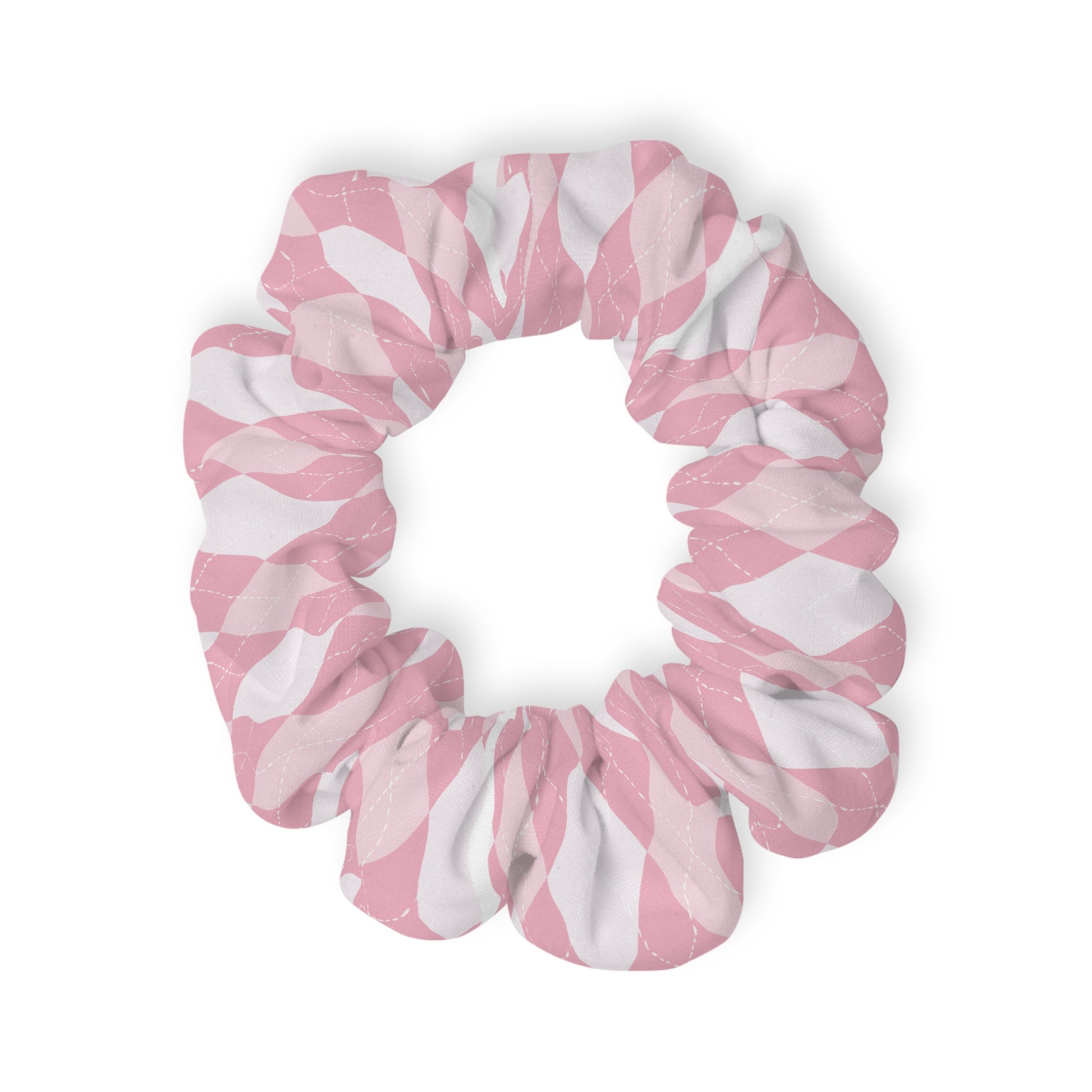 Introducing the Pink Diamonds Scrunchie: a stylish accessory to elevate any hairstyle. Crafted from 100% polyester jersey knit fabric, this scrunchie features a chic pattern of pink diamonds, adding a touch of elegance to your look. Measuring 4'' × 4'', it offers a comfortable and secure fit for all hair types. Perfect for adding a sophisticated and trendy flair to your everyday style.