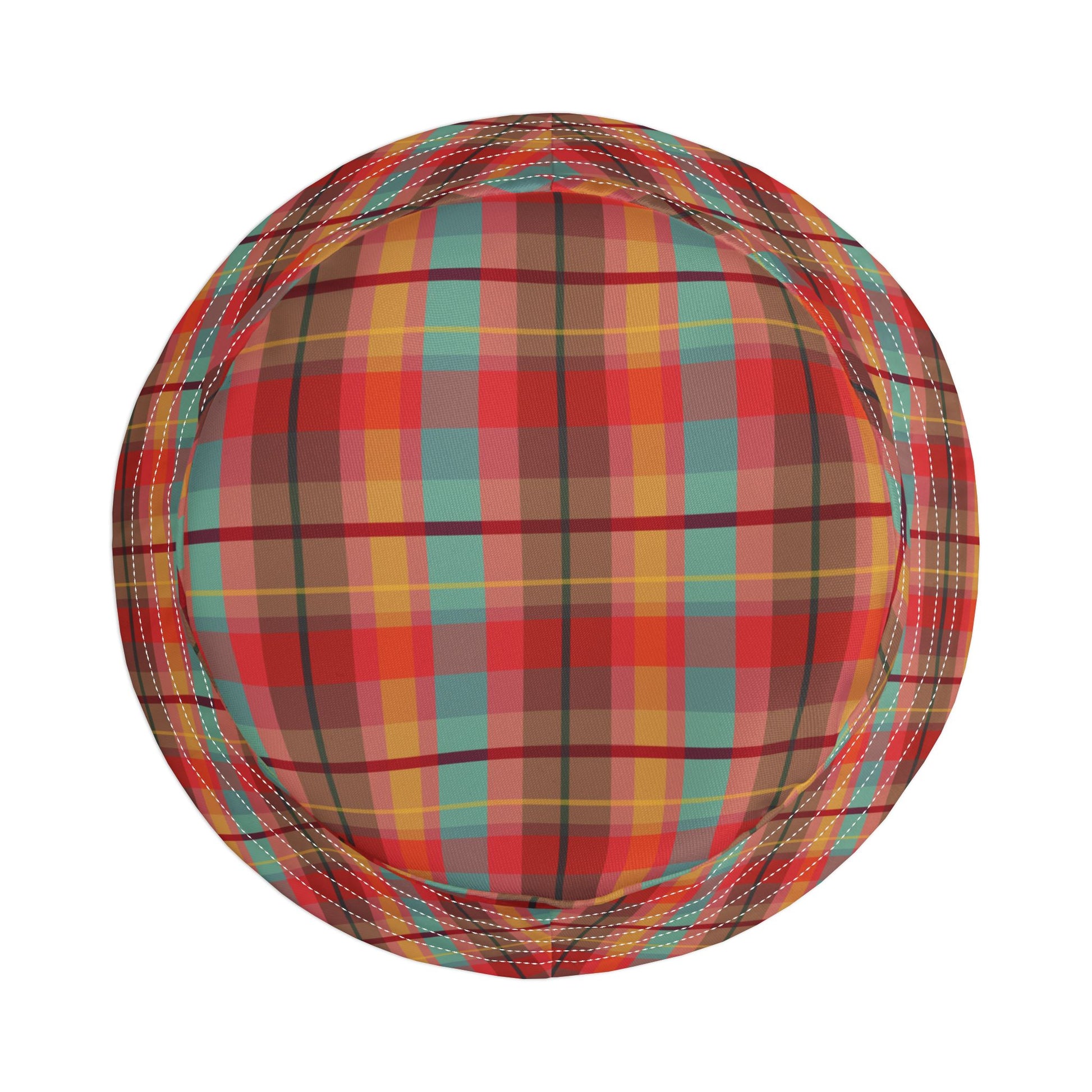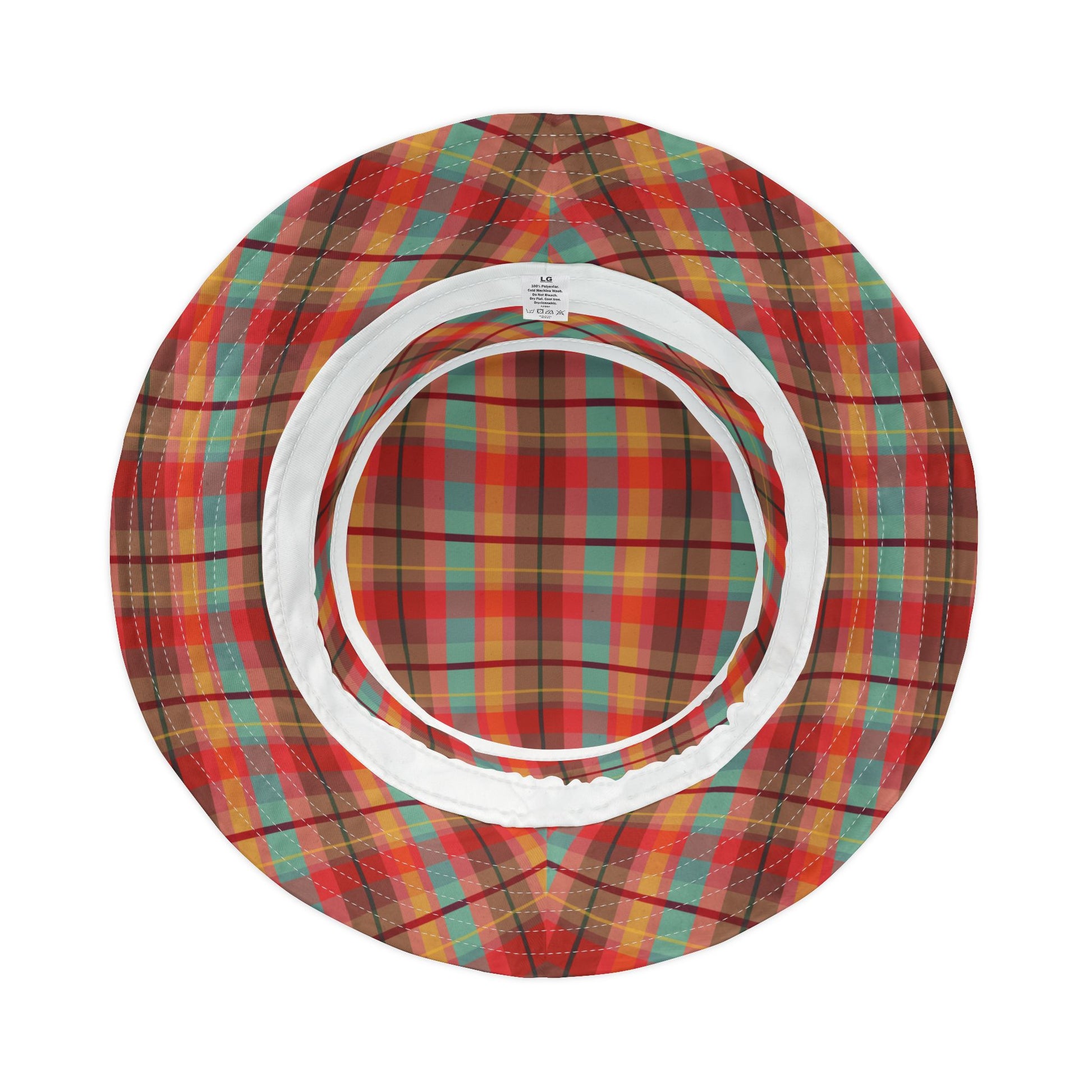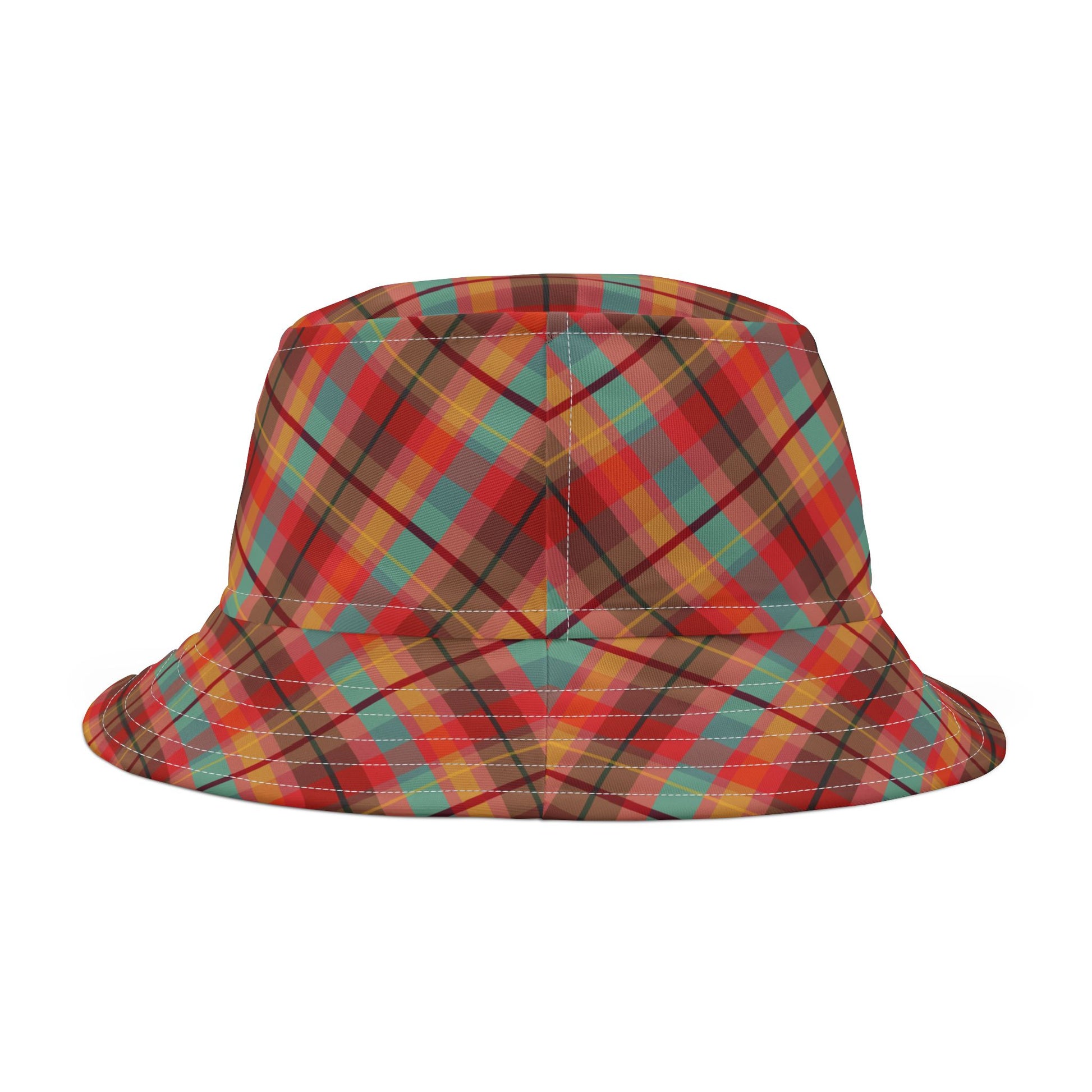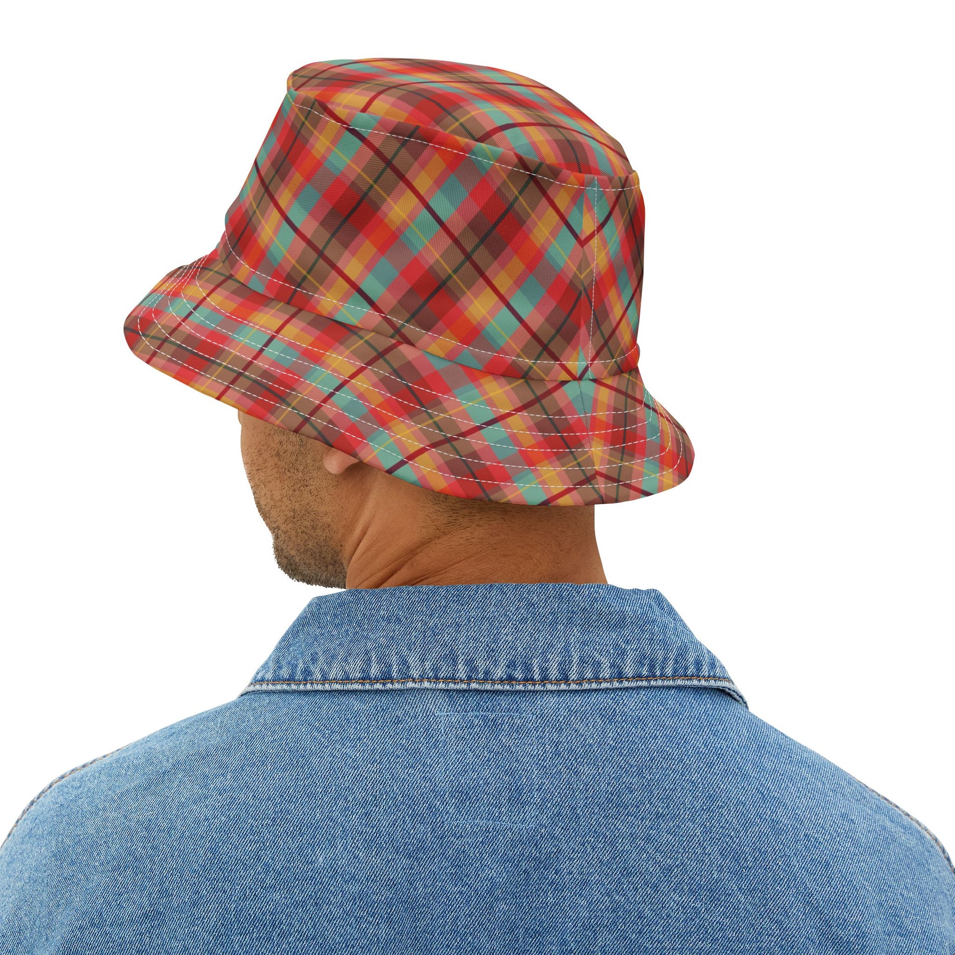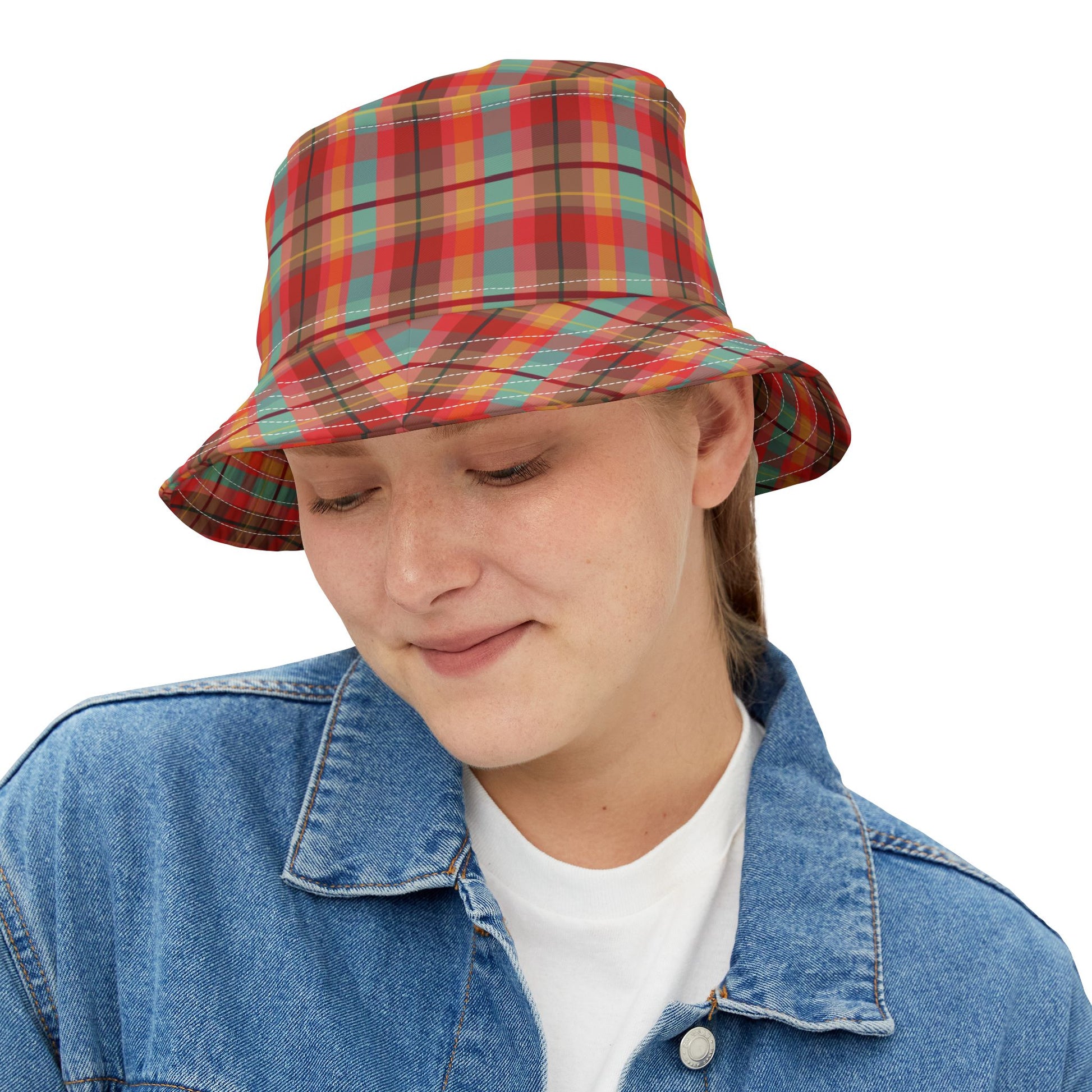Orange & Teal Plaid Bucket Hat that is versatile and stylish. Perfect for sunny days and music festivals. Relevant for those who love outdoor activities and casual fashion. Ideal for summer, festivals, beach trips, and picnics.