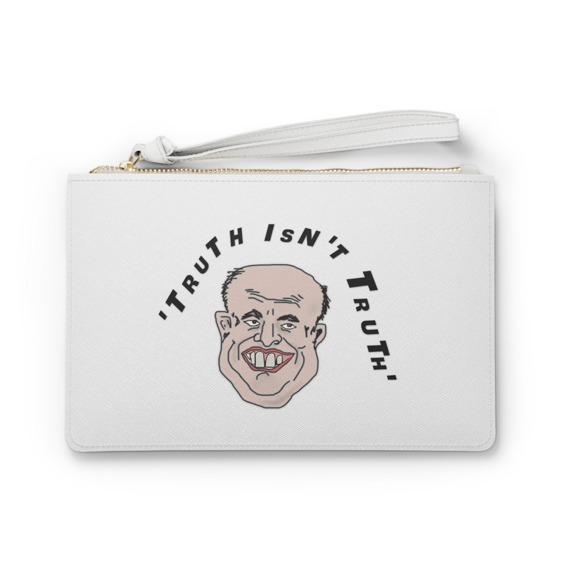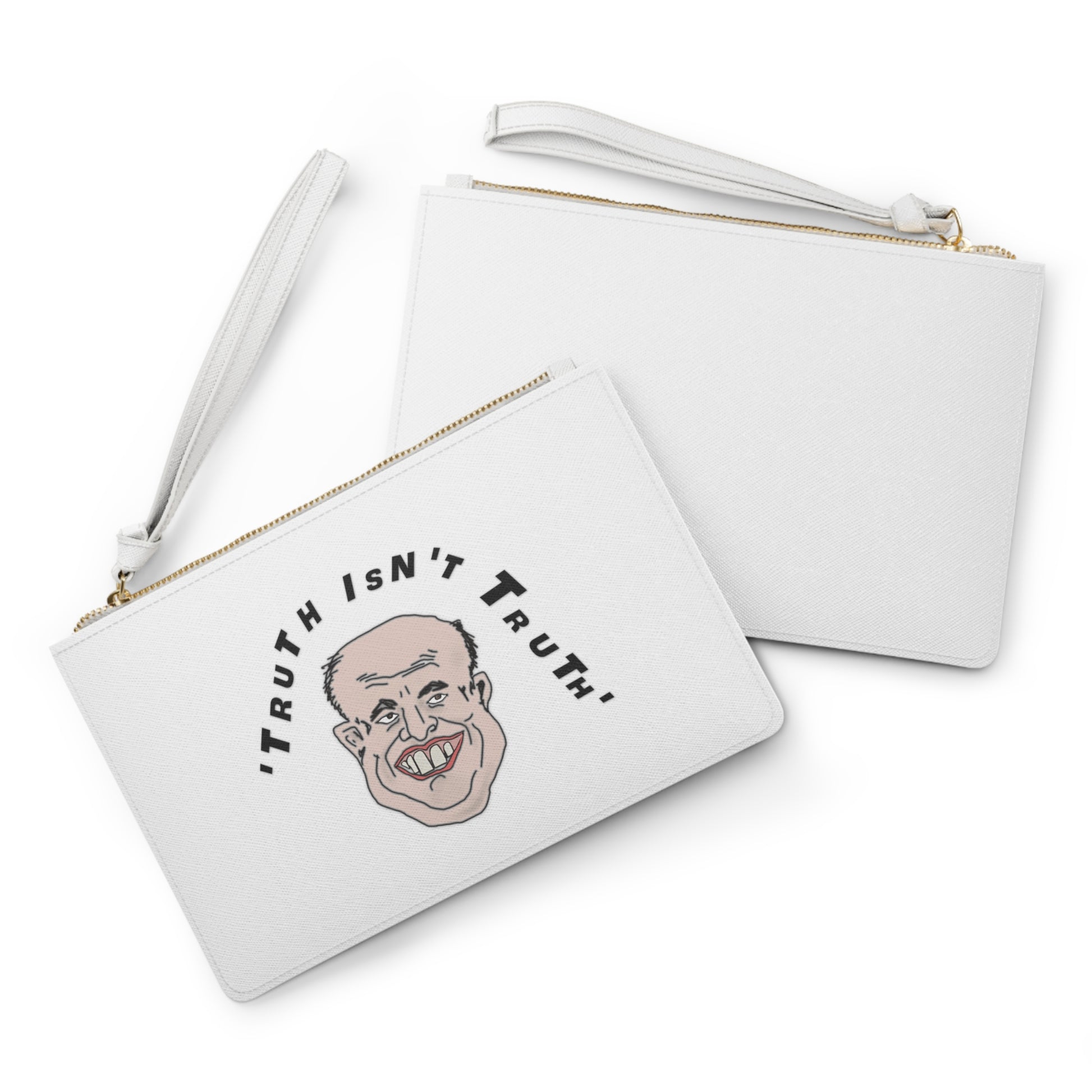 Introducing the Rudy's Truth Clutch Bag from our Politics collection. This stylish clutch is designed with a loop handle to quickly free your hands, making it the perfect accessory for a night out or a day of errands. The 100% PU faux leather material ensures durability and easy maintenance, while the zip fastening and fully lined internal pocket keep your everyday essentials secure. With a one size measurement of 9.5" x 6.6" (24 x 17 cm) and a wrist strap for added convenience, this clutch can easily hold your phone, wallet, and keys while keeping you on-trend. Upgrade your accessory game with the Rudy's Truth Clutch Bag.