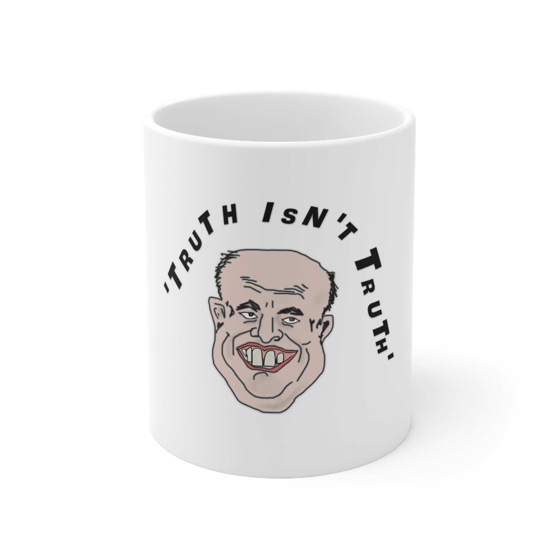 Introducing the Rudy's Truth Coffee Mug, a must-have addition to your mug collection. This 11-ounce mug is made of white, durable ceramic and is both BPA and Lead-free, making it safe for daily use. It's also microwave and dishwasher-safe for added convenience. The Politics collection features a unique hand-drawn design that is both quirky and original, making it the perfect conversation starter at your next coffee break. Treat yourself to this eloquent and one-of-a-kind mug and indulge in your favorite hot beverage in style.