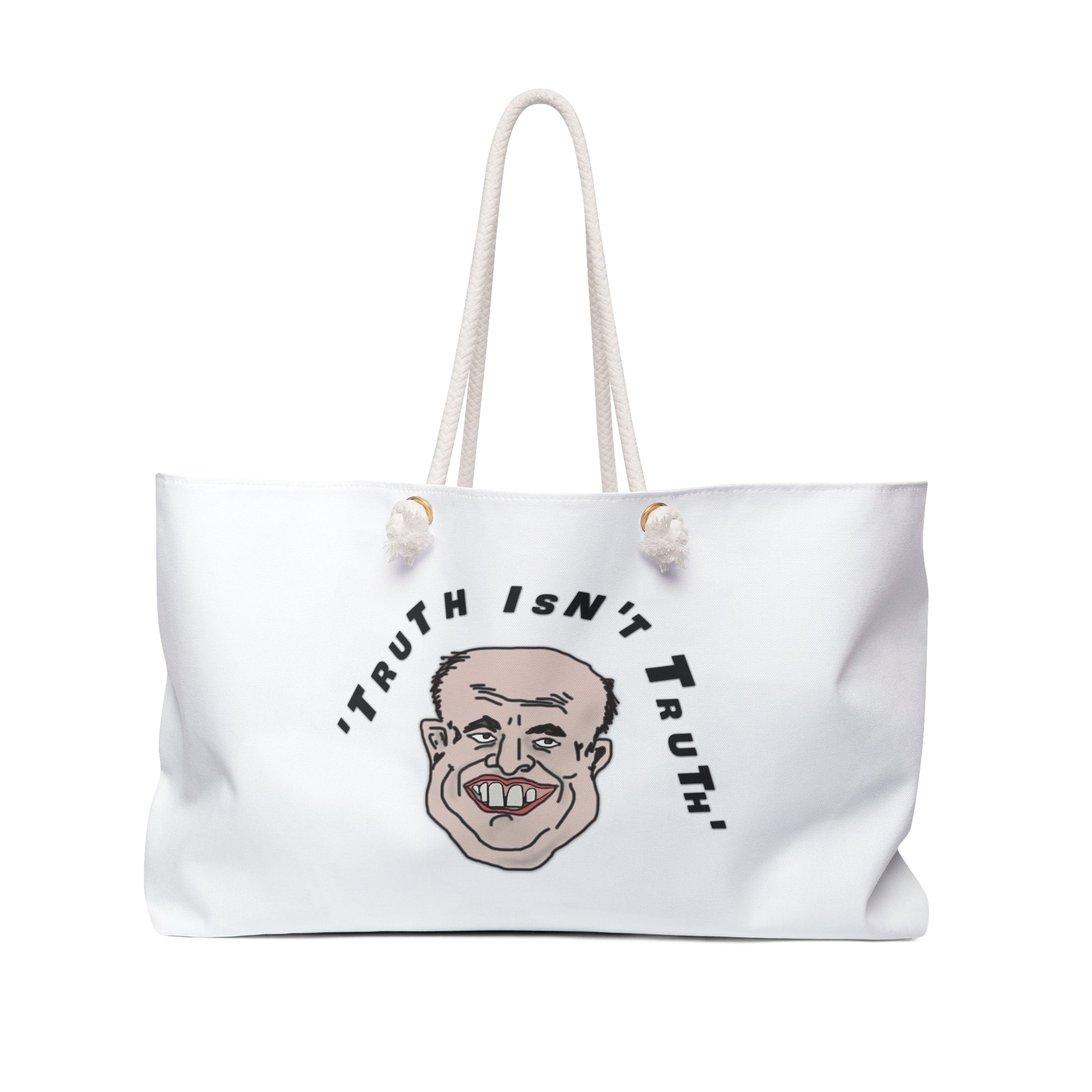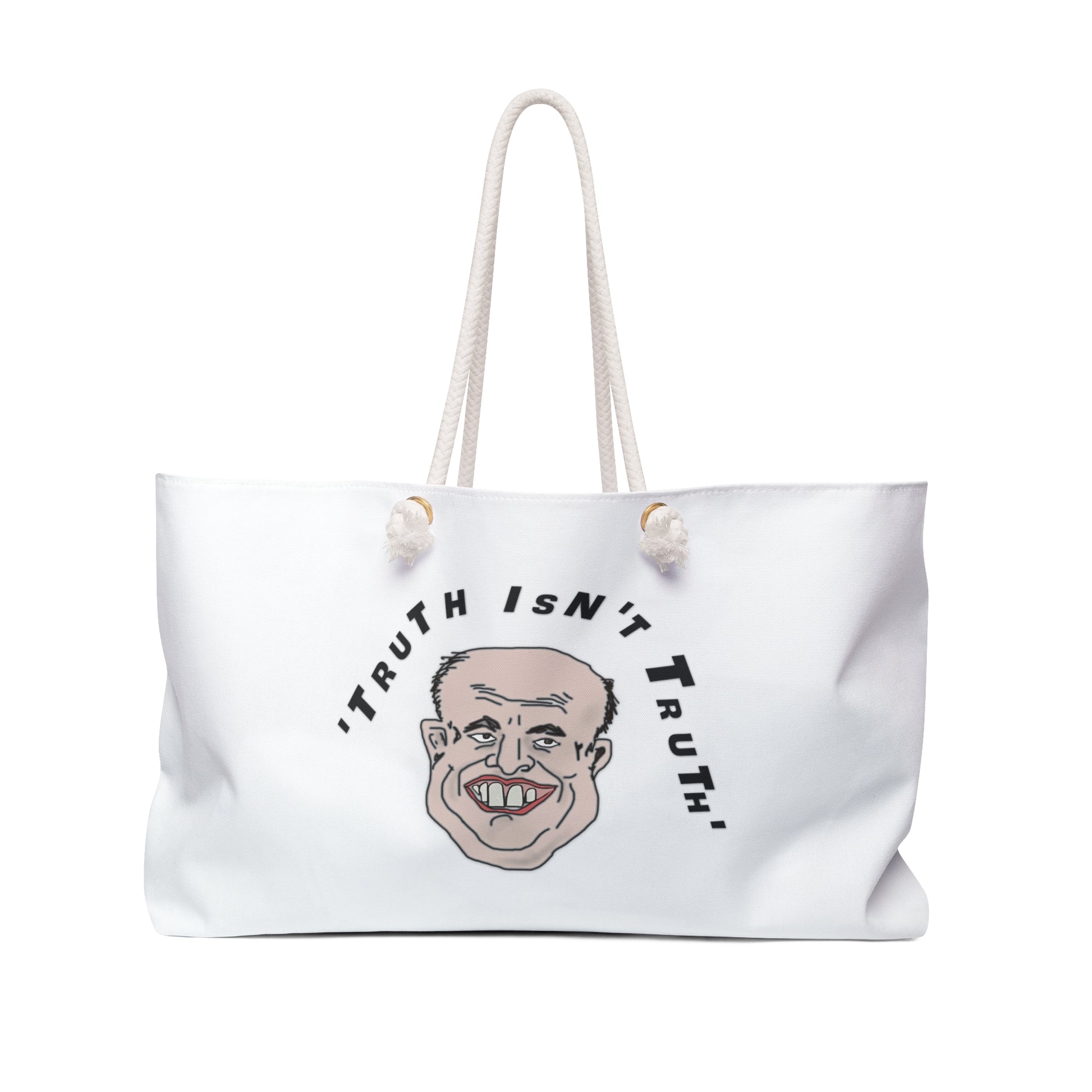 Introducing the Rudy's Truth Weekender Bag from our Politics collection. This oversized Weekender Tote is the perfect travel companion for a weekend at the beach or in town. The wide-mouthed, durable bag holds a generous amount of personal items and is easily held by its thick rope handles, making it the ideal bag for a quick getaway. This one size bag measures 24" x 13" (60.9 cm x 33 cm) and is made of 100% Spun Polyester, ensuring both style and durability. Make a statement while on the go with the Rudy's Truth Weekender Bag.