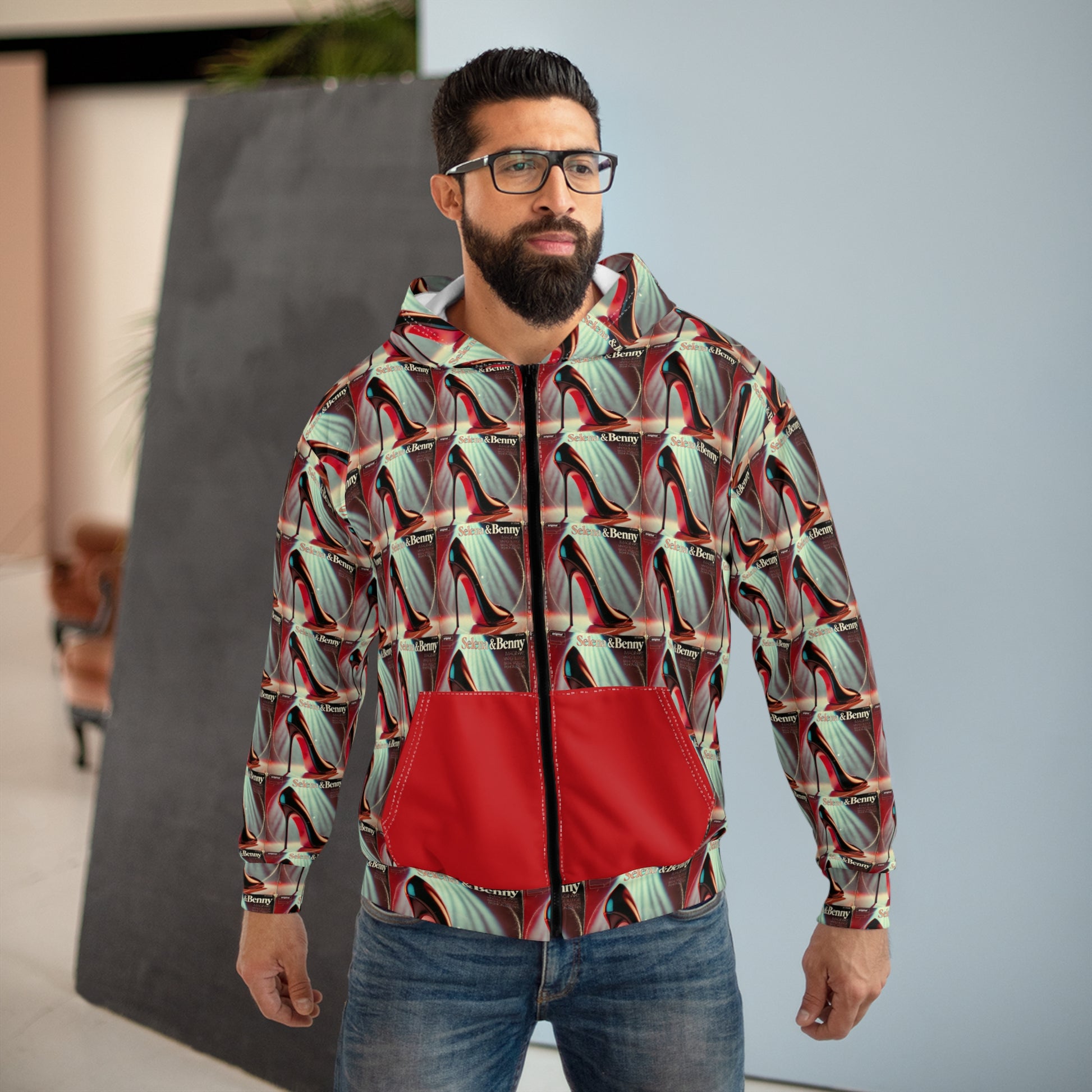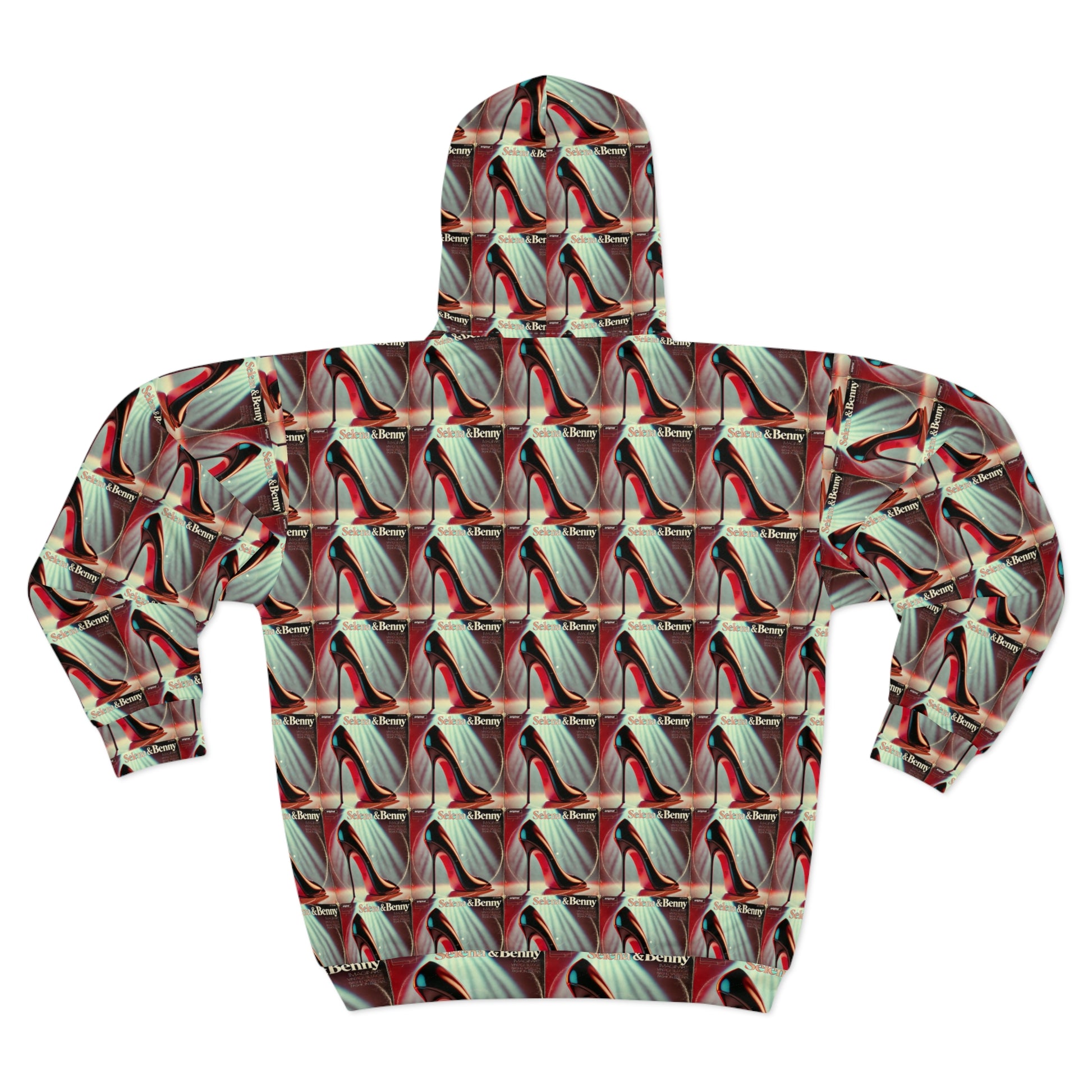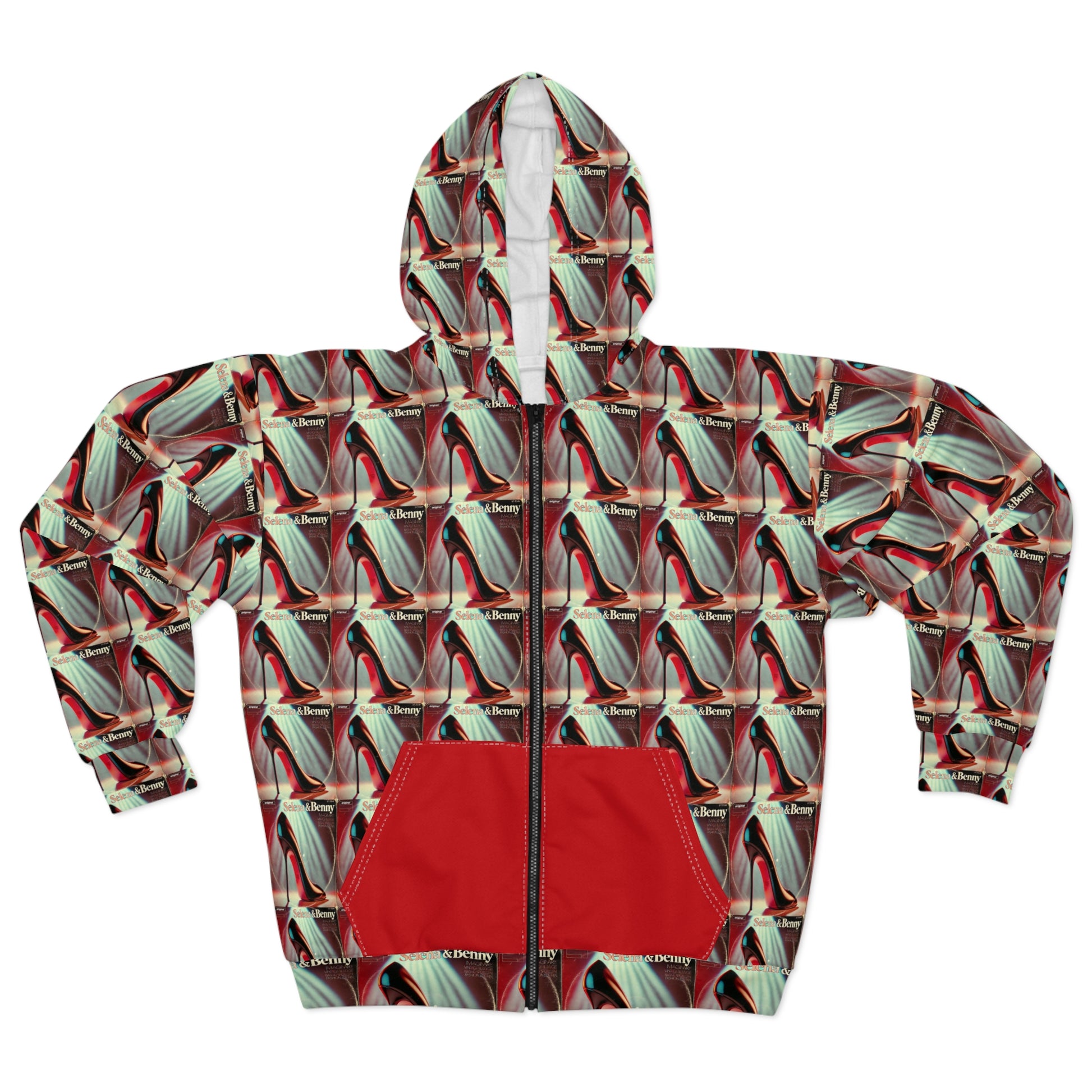 Channel the mood of a love story turned streetwear statement with the Selena & Benny Zip Hoodie. A striking tribute to the duo’s heartfelt album I Said I Love You First, this bold zip-up brings album art to life in the form of a fierce red stiletto set against dreamy vintage tones. The print captures that cinematic tension between vulnerability and power—just like their lyrics. With vivid red kangaroo pockets and all-over graphics, it’s a wearable record sleeve for romantics with an edge. Zip up and wear your love loud.
