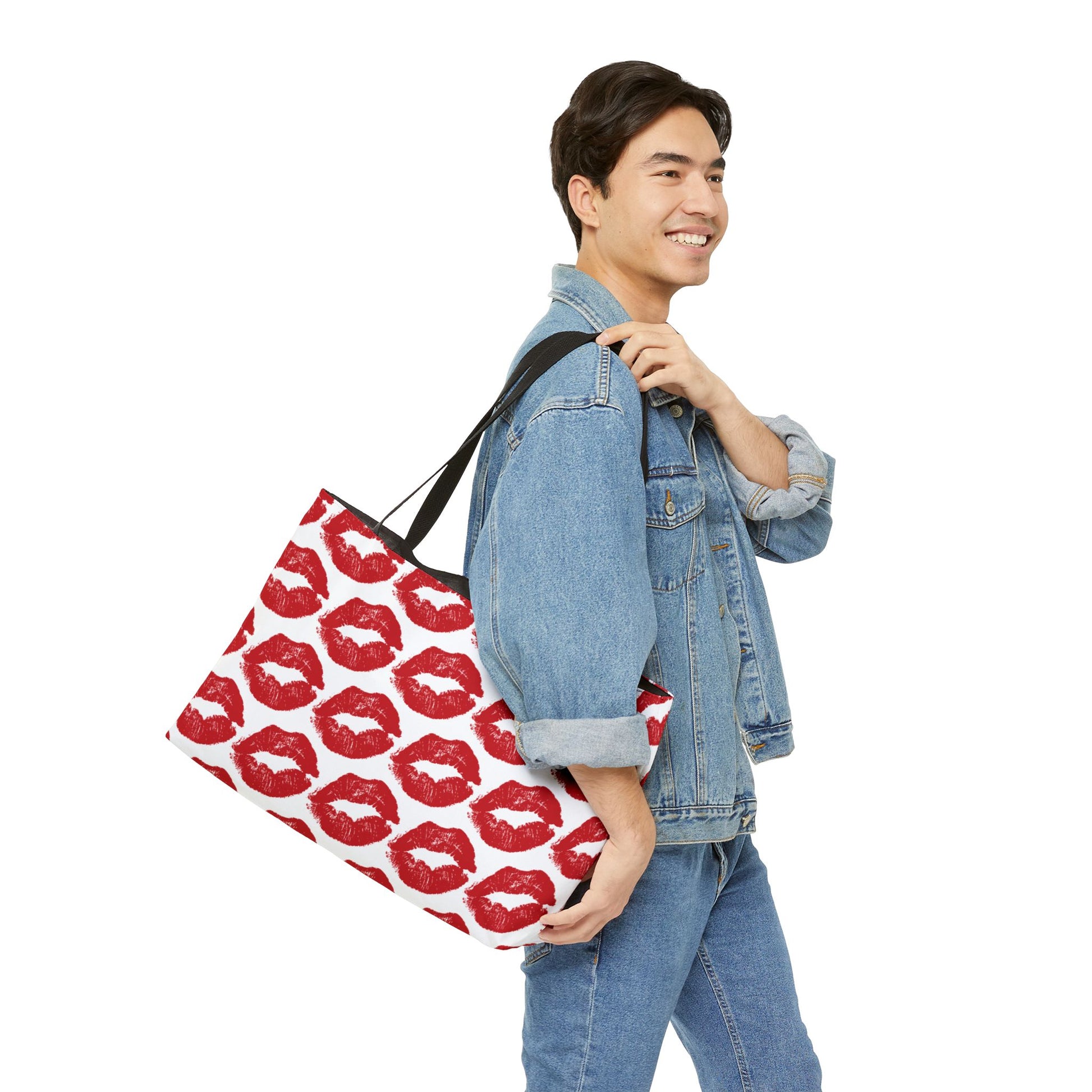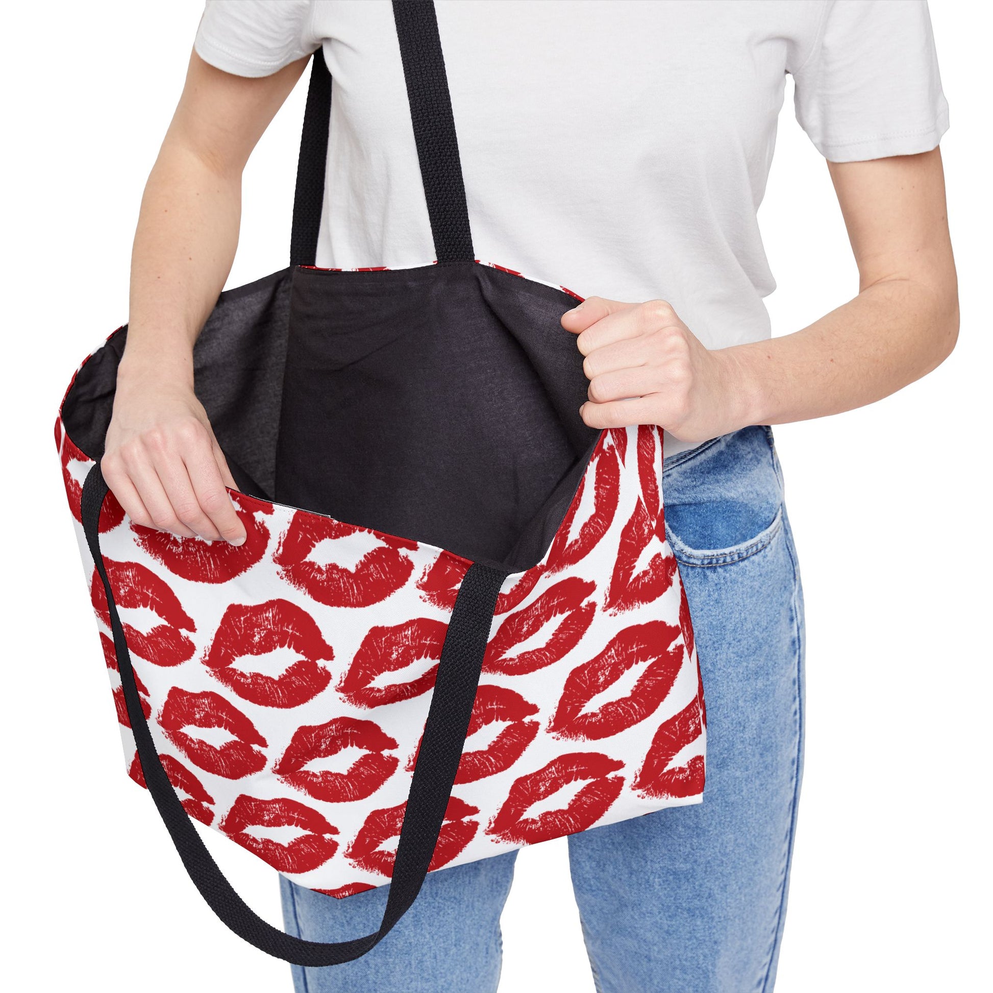 Introducing the perfect travel companion for your on-the-go lifestyle: our stylish travel-size canvas bag with a vibrant red smooch lipstick pattern. Made from 100% spun polyester, this chic accessory is as durable as it is fashionable. Measuring 24" x 13" (60.9 cm x 33 cm), it offers ample space to store your cosmetics, toiletries, or daily essentials while remaining compact and lightweight. The sleek black interior lining adds a touch of sophistication and keeps your items secure with its sturdy zipper closure. Whether you're jet-setting across the globe or simply heading to the gym, this versatile bag is designed to meet your needs with flair. Embrace convenience without compromising on style with this must-have travel accessory, perfect for women, teens, and fashion enthusiasts alike. Elevate your travel game and make a statement wherever you go with our trendy, practical, and irresistibly cute canvas bag.