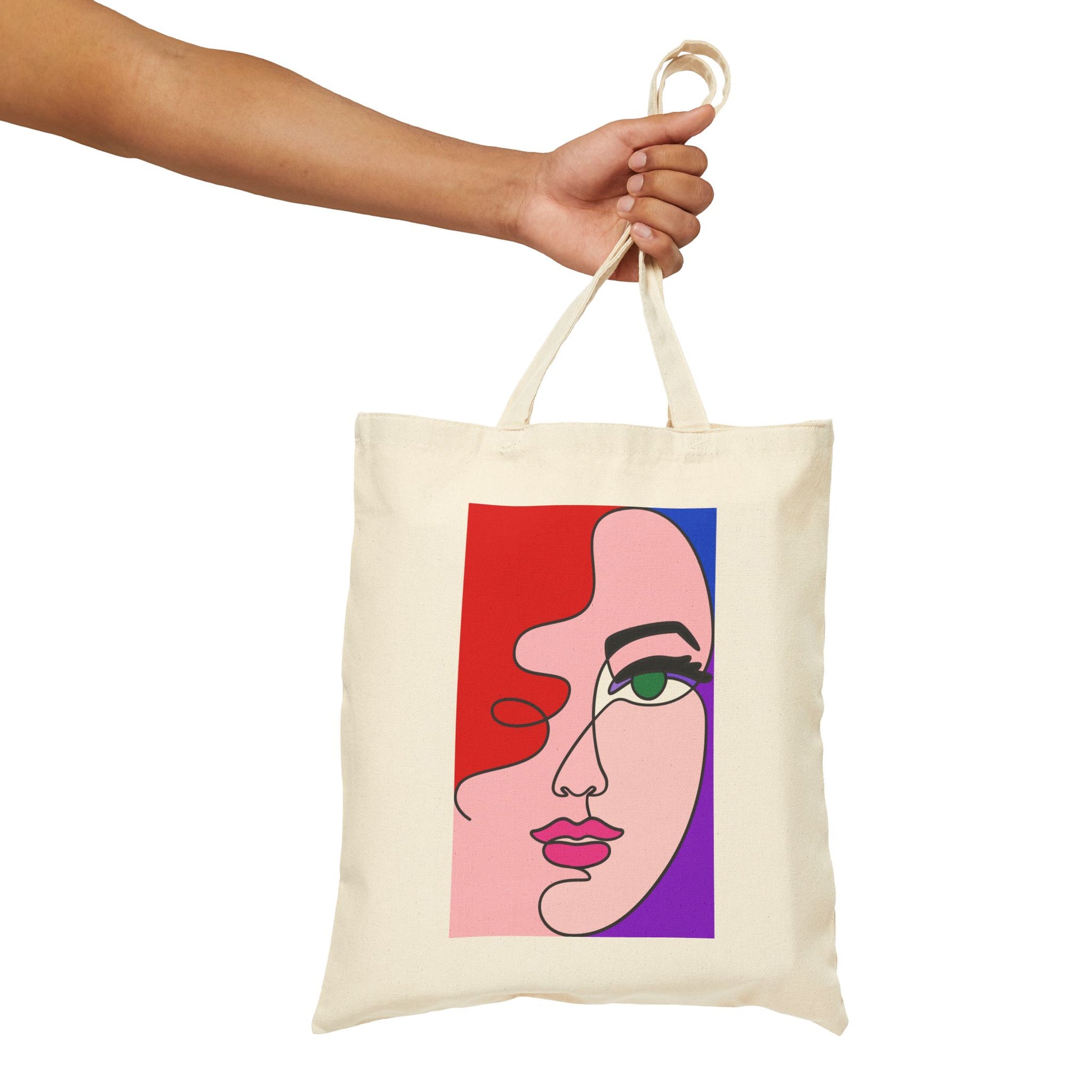 Meet the Courtesan Tote: 100% cotton canvas with a vibrant one-line drawing of a young woman’s face. Stylish, durable, and perfect for any occasion!