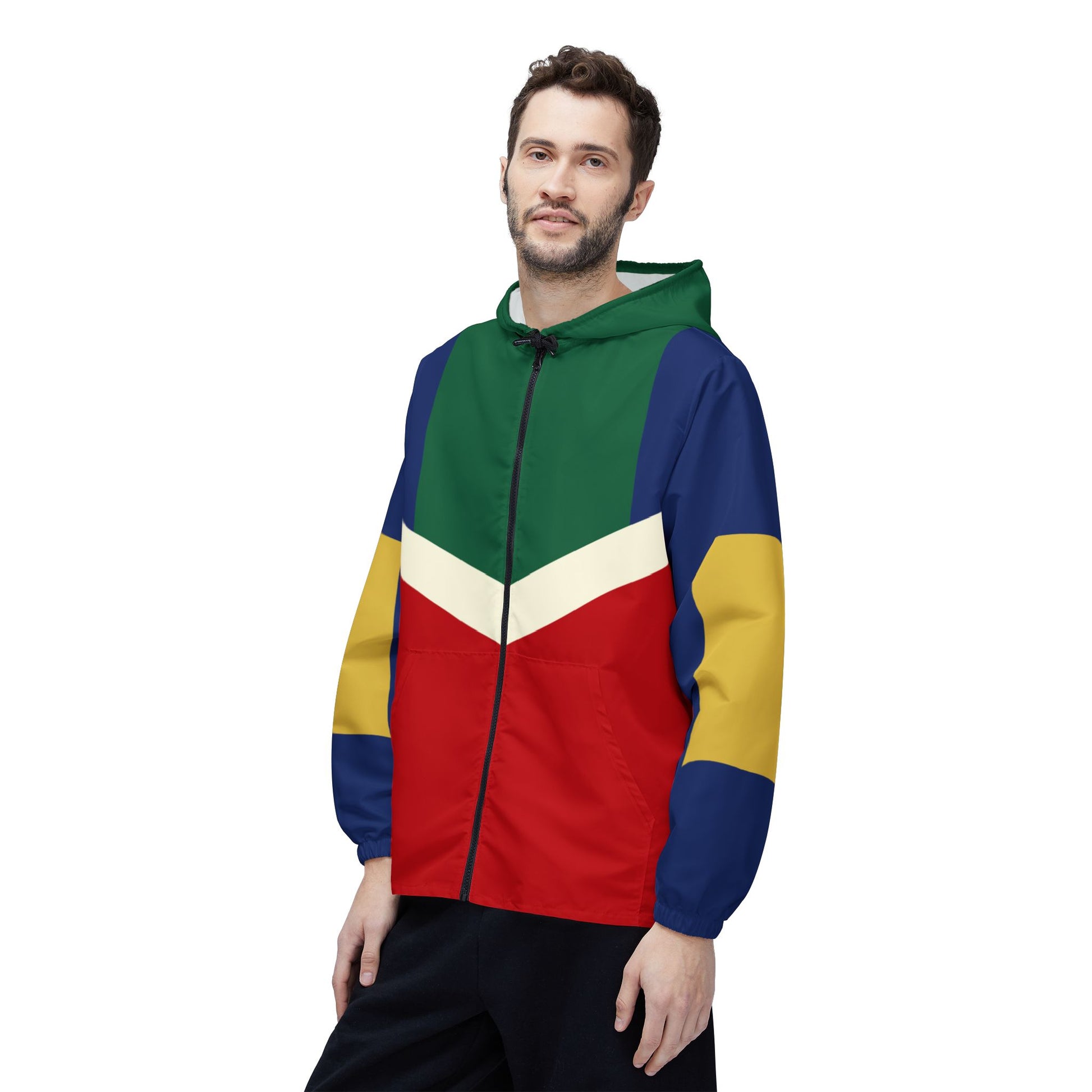 The Village Windbreaker Jacket is the perfect blend of style, durability, and functionality. Made from 100% premium polyester, this jacket is designed to withstand the elements while keeping you comfortable and looking great. Its wind and water-resistant properties ensure protection against unpredictable weather, making it an excellent choice for outdoor adventures, city commutes, or everyday wear. The lightweight yet strong fabric offers breathability without compromising on durability, allowing you to stay active and stylish all day long. Featuring a full-zip front, adjustable hood, and a striking geometric design with bold colors, this jacket is both practical and fashion-forward. A subtle yet stylish detail, the Tantrum Media logo is featured small on the back, adding a signature touch to this unique piece. Whether you're layering up for a cool evening or need a versatile jacket for sudden weather changes, the Village Windbreaker Jacket is your go-to outerwear for any occasion.
